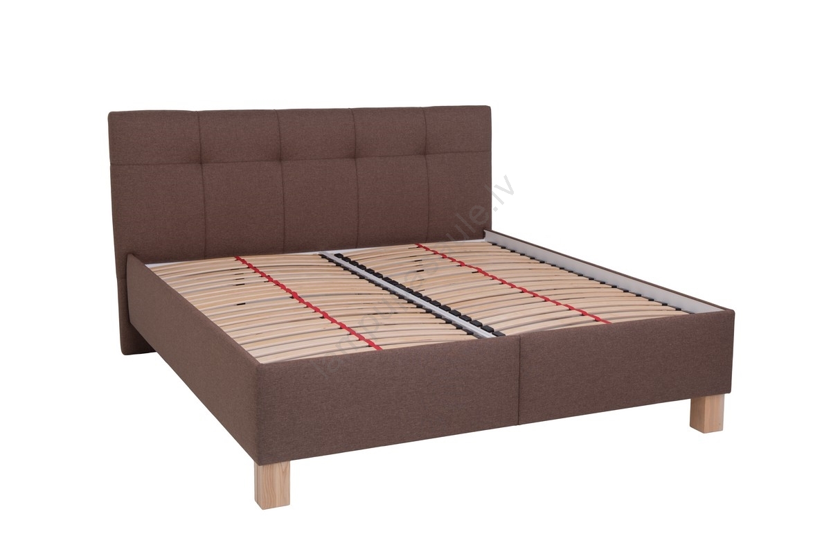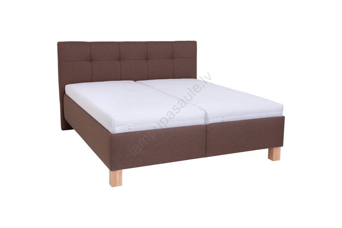 • Tapicerēta divvietīga gulta ar brīvi novietotām matracēm lepojas ar rūpīgi izstrādātu, eleganti šūtu galvgali.