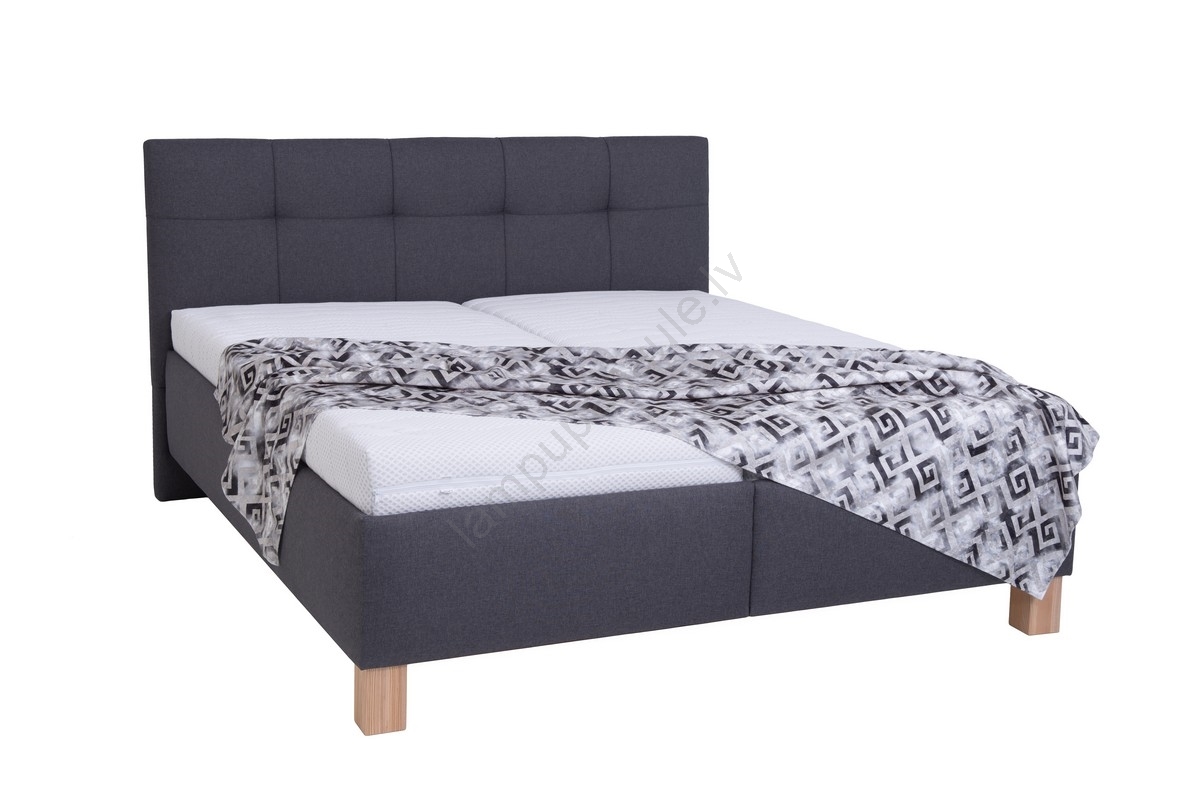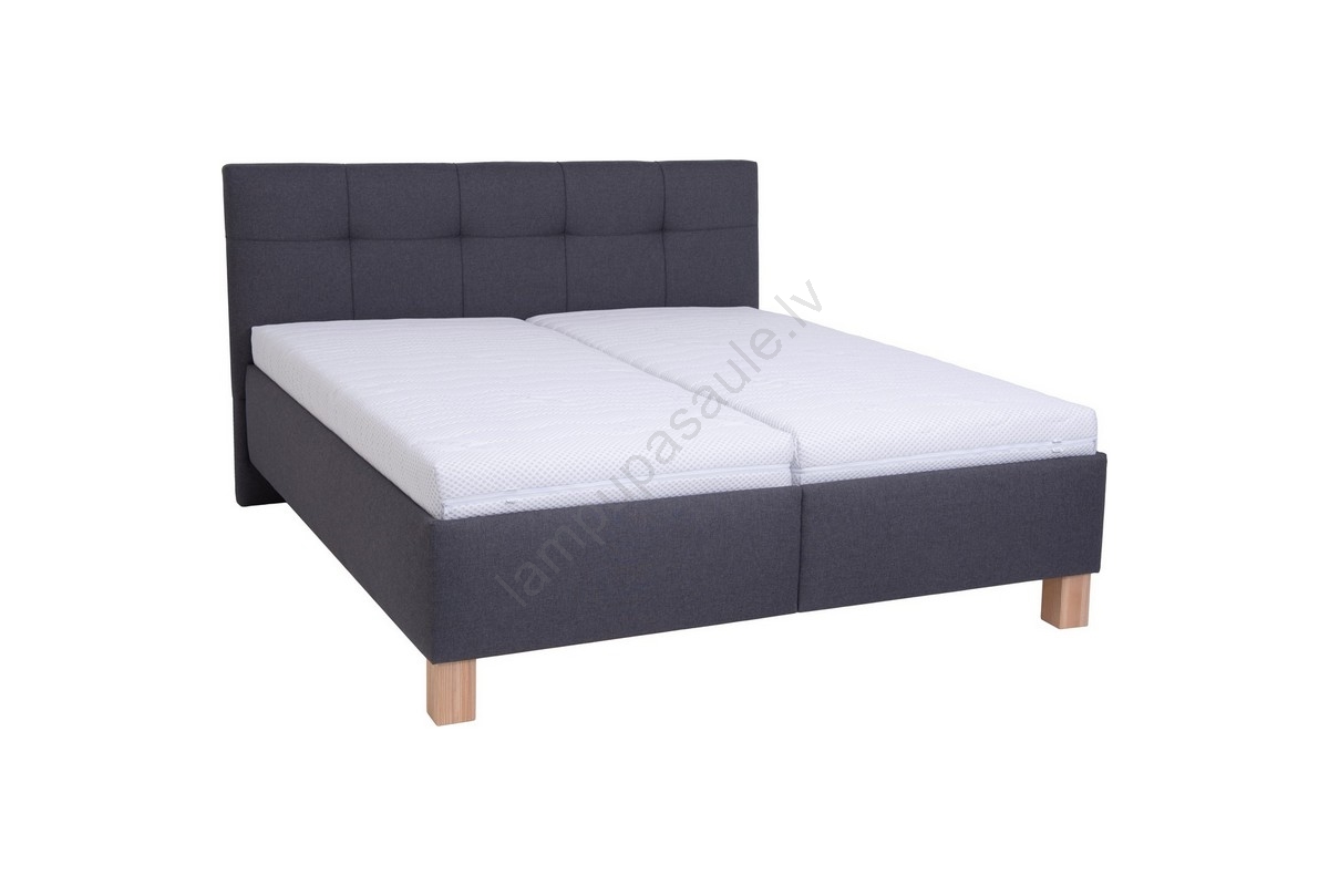 • Polsterēta divvietīga gulta ar brīvi novietotām matracēm lepojas ar rūpīgi izstrādātu, eleganti pāršūtu galvgali.