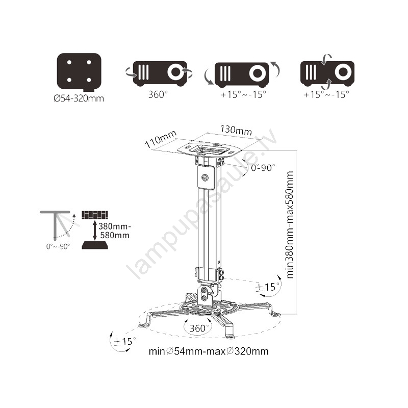 • Regulējams augstums optimālai projekcijai — 380 až 580 mm no griestiem.
