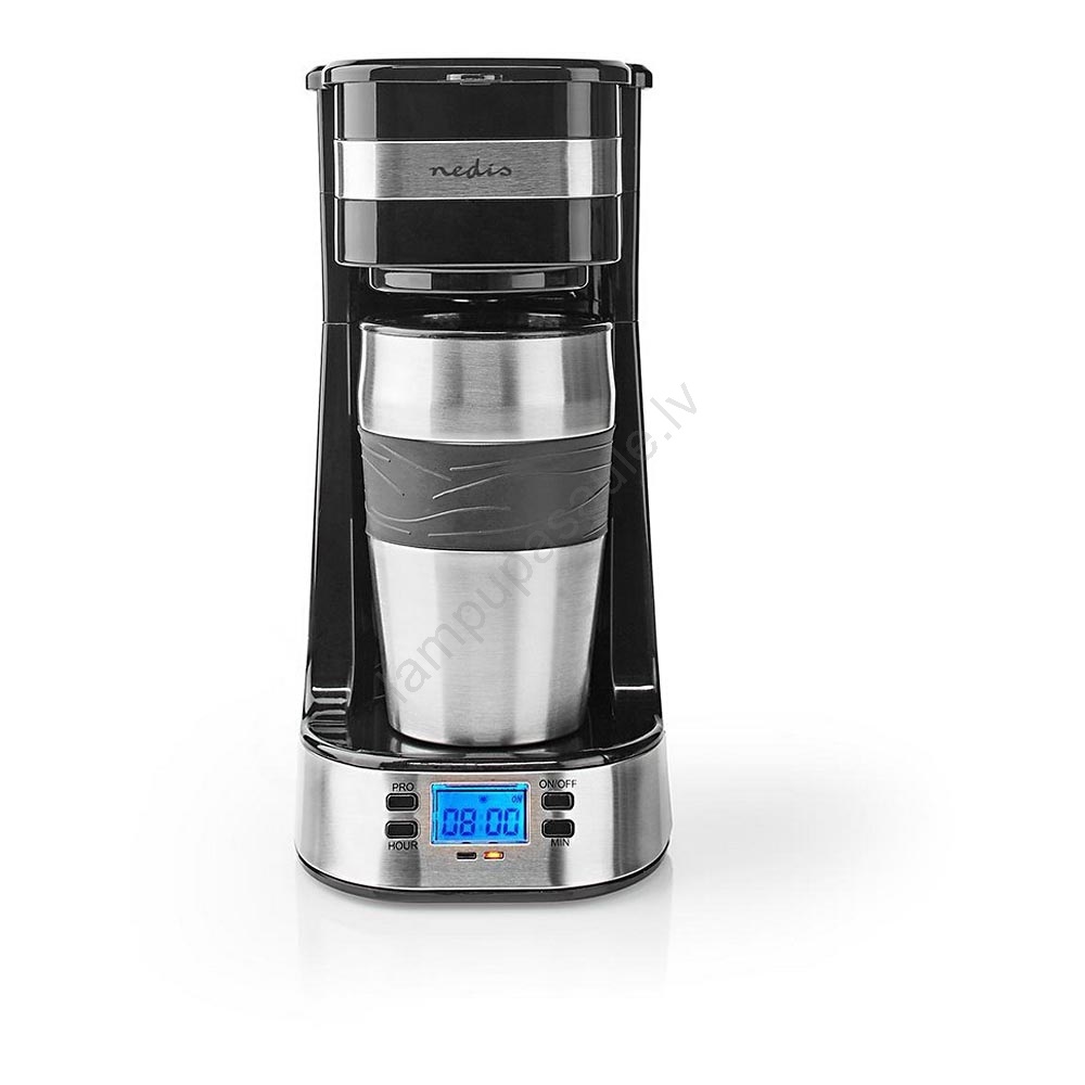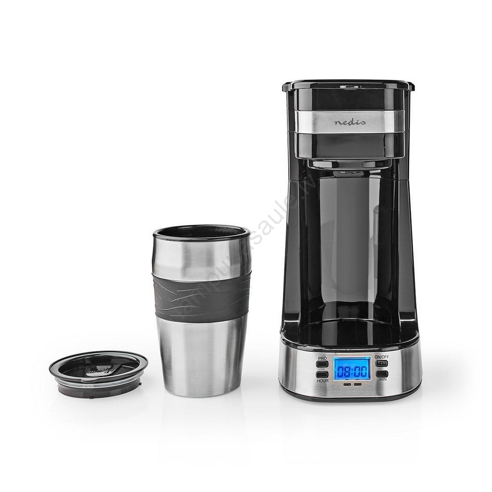 Nedis KACM310FBK - Kafijas automāts vienai krūzei 0,42 L ar taimeri un ceļojuma krūzi | Lampupasaule