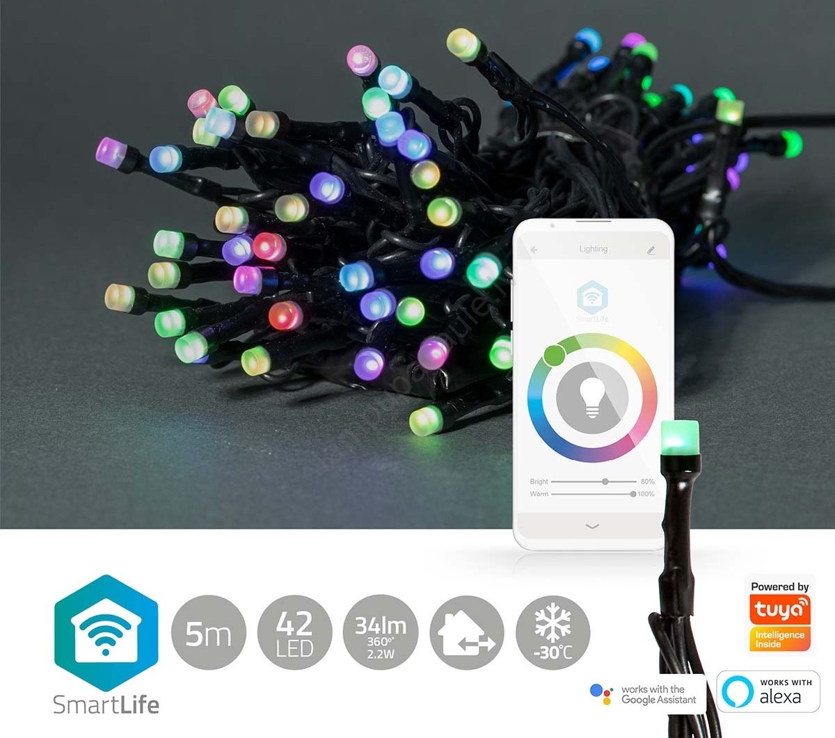 • Izmantojot balss vadību, izmantojot Amazon Alexa vai Google Assistant, jūs varat ieslēgt un izslēgt virteni, kā arī aptumšot vai regulēt tās spilgtumu tikai ar balss komandu.