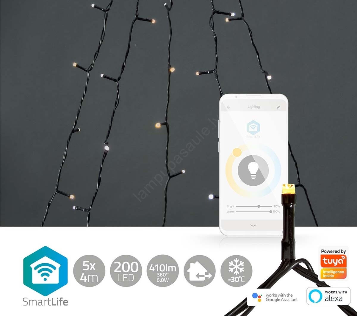 • Izmantojot balss vadību, izmantojot Amazon Alexa vai Google Assistant, jūs varat ieslēgt un izslēgt virteni,  aptumšot vai regulēt tās spilgtumu tikai ar balsi.