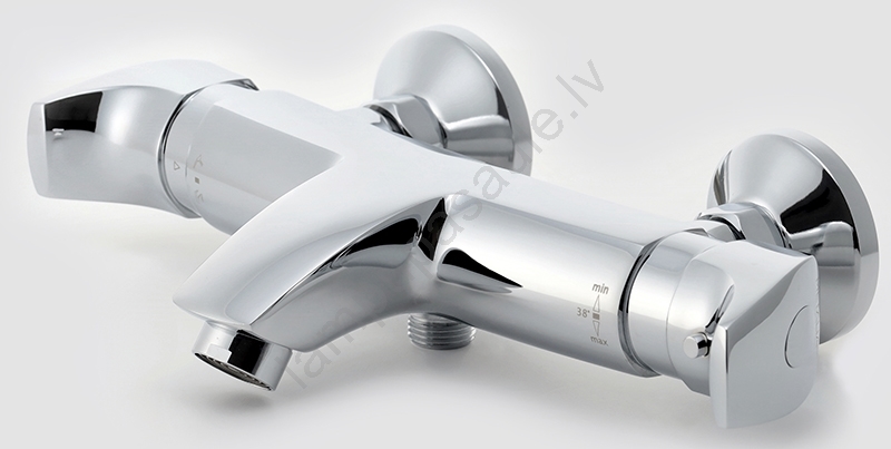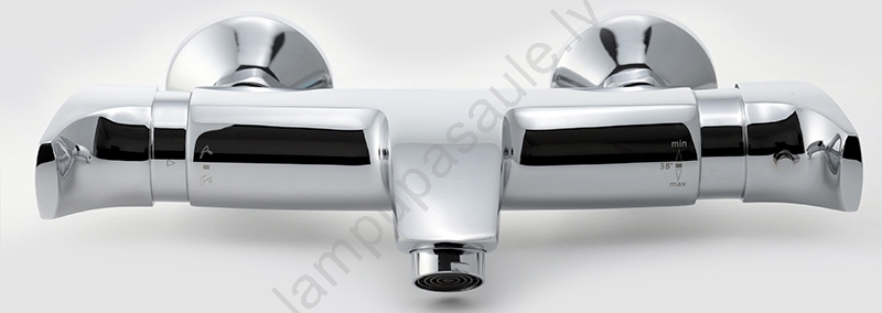 • Termostats atrodas labajā pusē, ūdens plūsmas vadība kreisajā pusē.