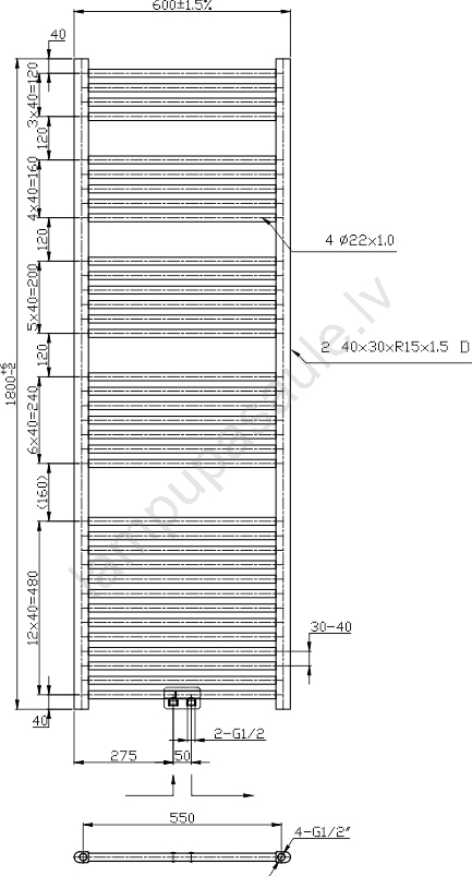 Novaservis - vannas istabas dvieļu žagata radiators, 630W/230V, 180x60 cm, spīdīgs hroms, taisns | L