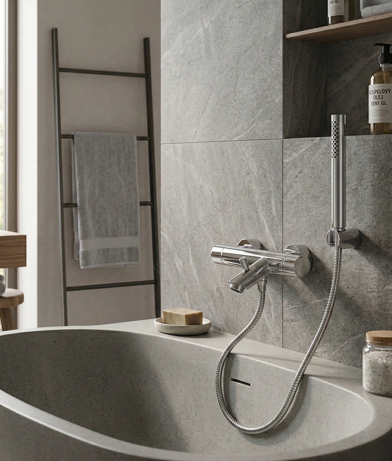 • Sienas stiprināms vannas jaucējkrāns ar pilnu piederumu komplektu.