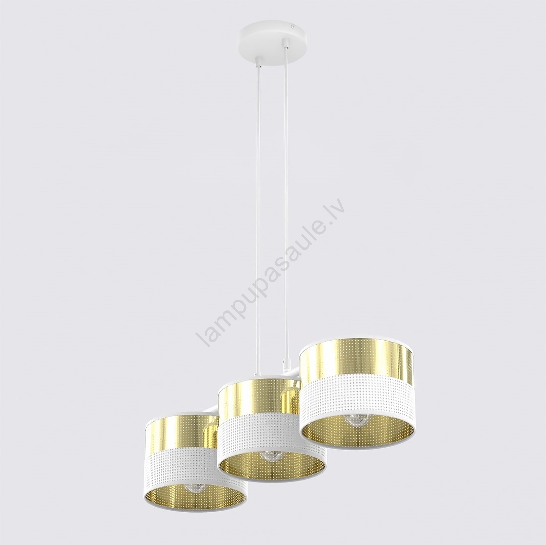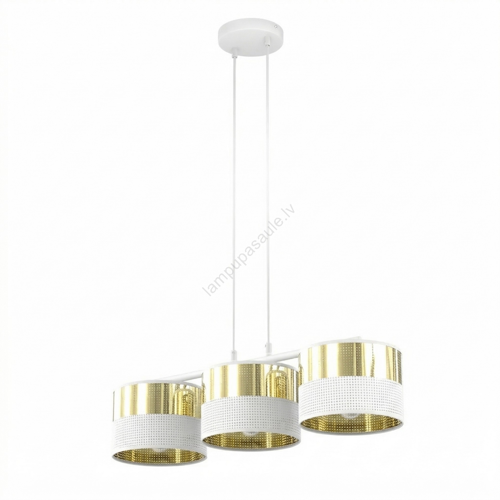 Pakaramā lustra uz kabeļa LUX 3xE27/15W/230V balta/zelta izceļas ar jauku un funkcionālu dizainu.  Spuldze ar E27 cokolu irpiemērota lampai. Šeit, varat iegādāties citas spuldzes par izdevīgām cenām. Tā būs interesants jūsu mājas papildinājums.