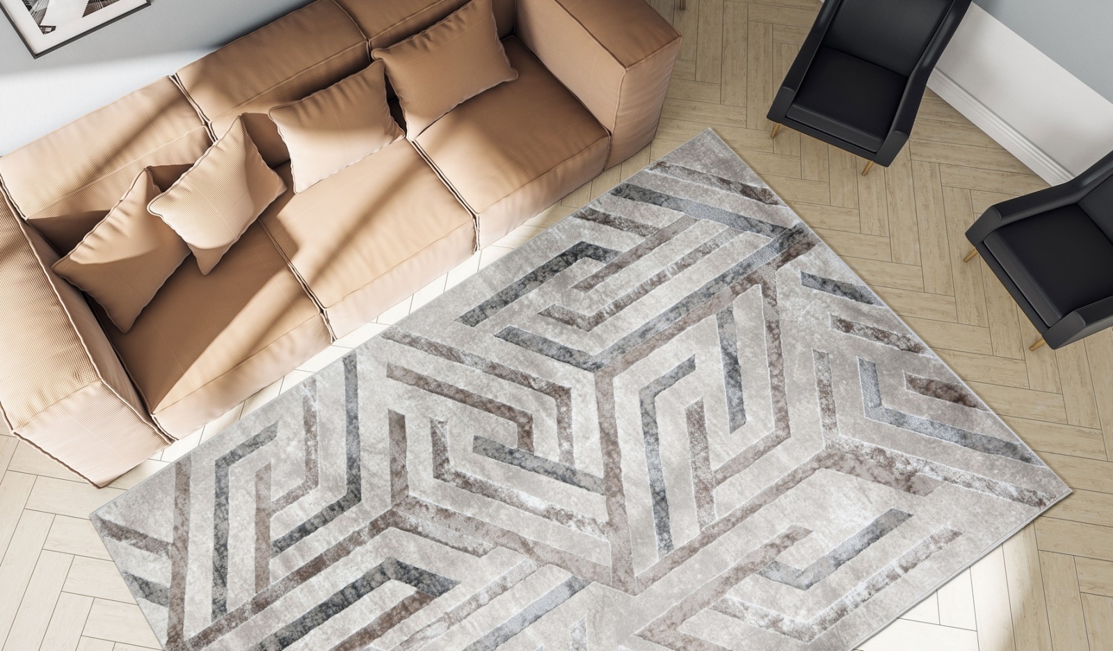 • Mūsdienīgs un funkcionāls paklājs ar ģeometrisku rakstu.