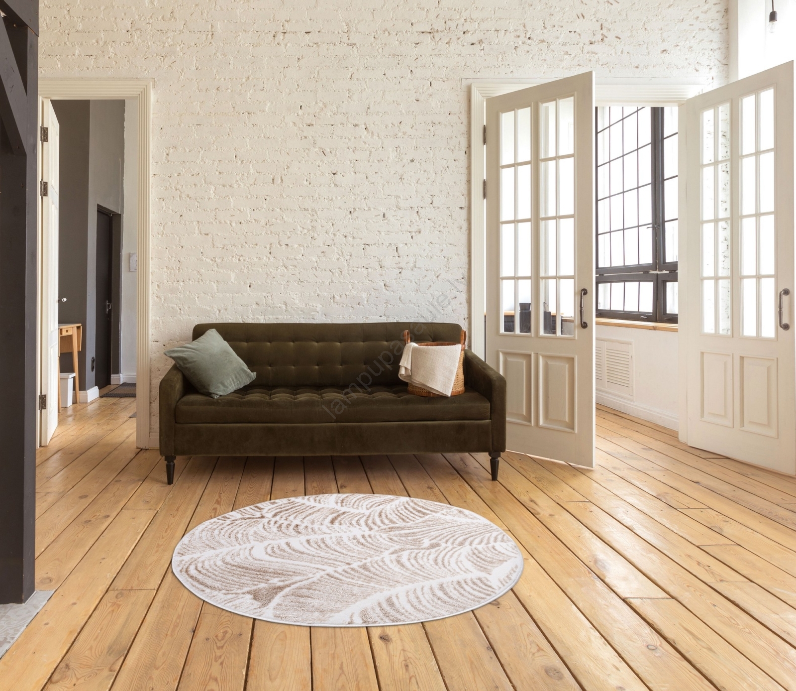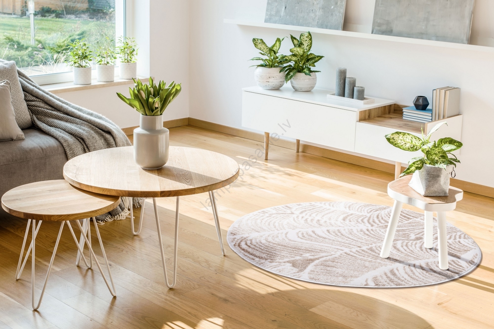 • Smalks bēšs paklājs ar izsmalcinātu lapu rakstu piešķirs jebkurai telpai viegluma un mājīguma noskaņu.