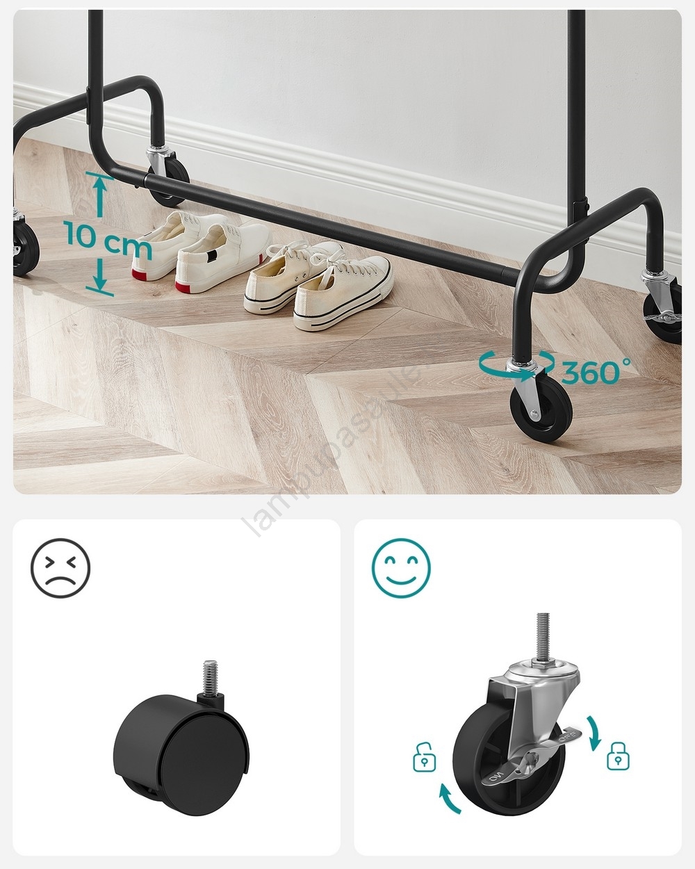 • Šis drēbju stends nodrošina pietiekami daudz vietas visu veidu apģērba pakarināšanai — lieliska izvēle mājas un komerciālai lietošanai, piemēram, apģērbu veikaliem, foto studijām, palīgtelpām un citur.