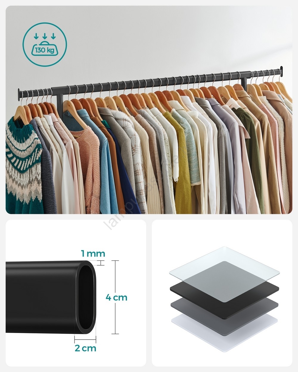 • Augšējā stieņa nesamība līdz 130 kg (vienmērīgā slodzē) bez svārstīšanās vai apgāšanās; izvelkamais stienis nodrošina papildu vietu jūsu apģērbam, cepurēm, somām utt.