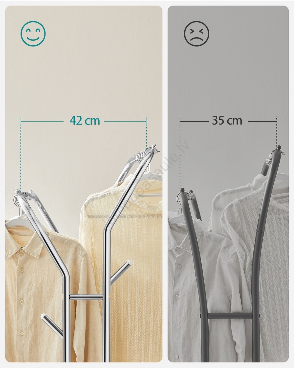 • 42 cm attālums starp drēbju pakarināšanas stieņiem nodrošina labu gaisa cirkulāciju un veicina ātru žūšanu.