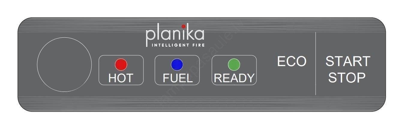 • Kontroles panelis ļauj manuāli ieslēgt un izslēgt kamīnu, pārslēgt uz ECO režīmu un vienlaikus signalizē, kad kurināmā tvertne ir tukša, kad kamīns ir gatavs ieslēgšanai un kad tas ir pārkarsts.