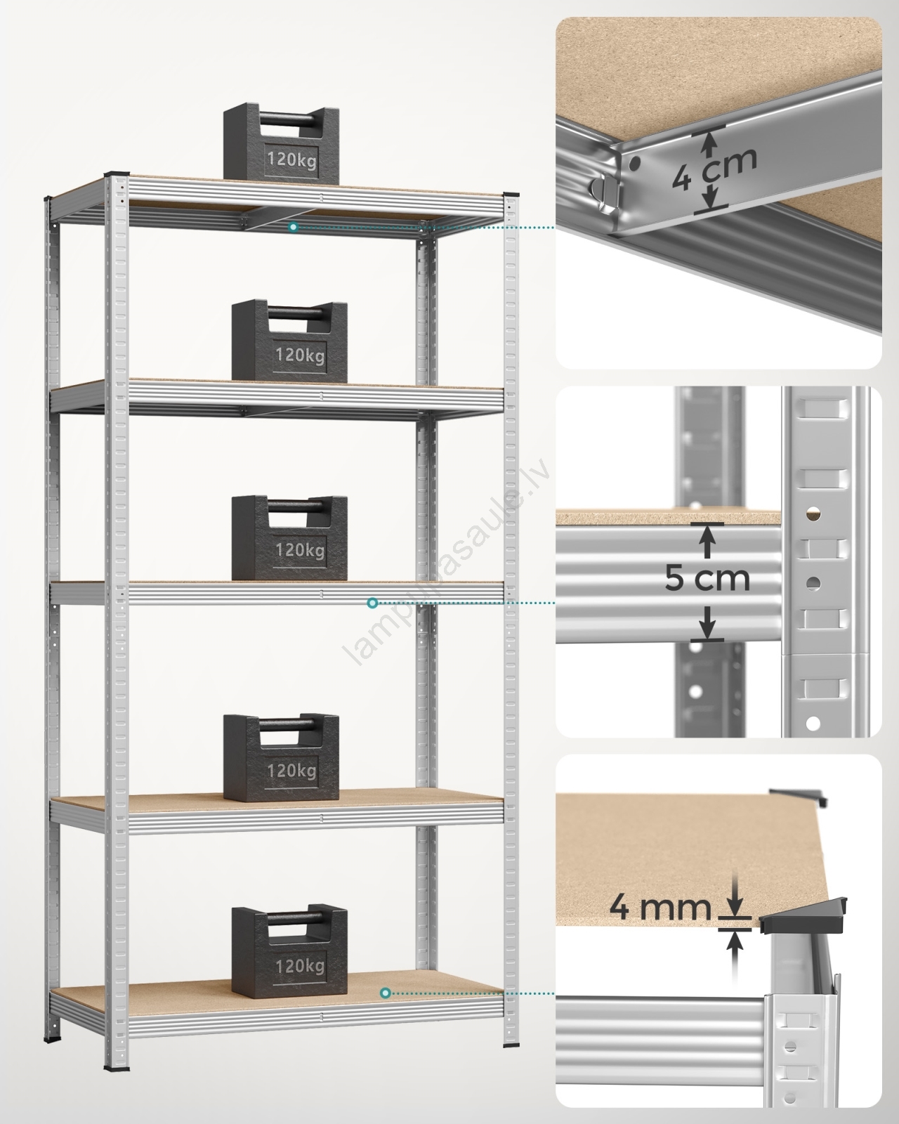• Katrs plaukts var izturēt līdz 120 kg un droši notur krāsas, instrumentus un fitnesa aprīkojumu.