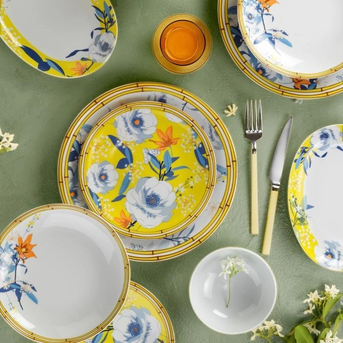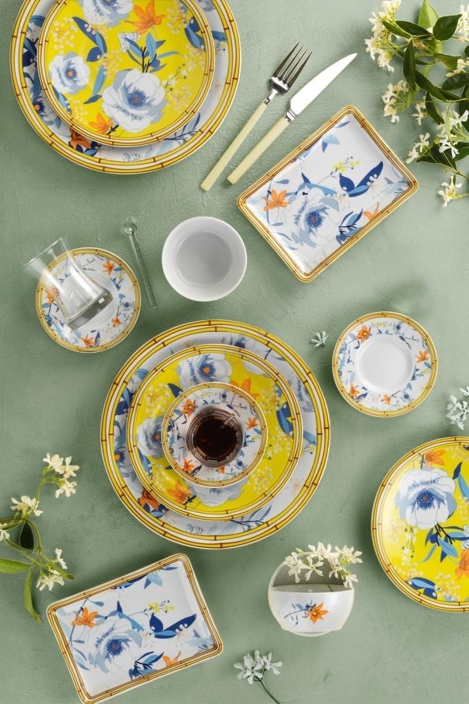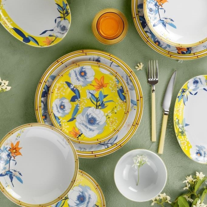 Porcelāna galda trauku komplekts, 50 gab., dzeltena/zila | Lampupasaule