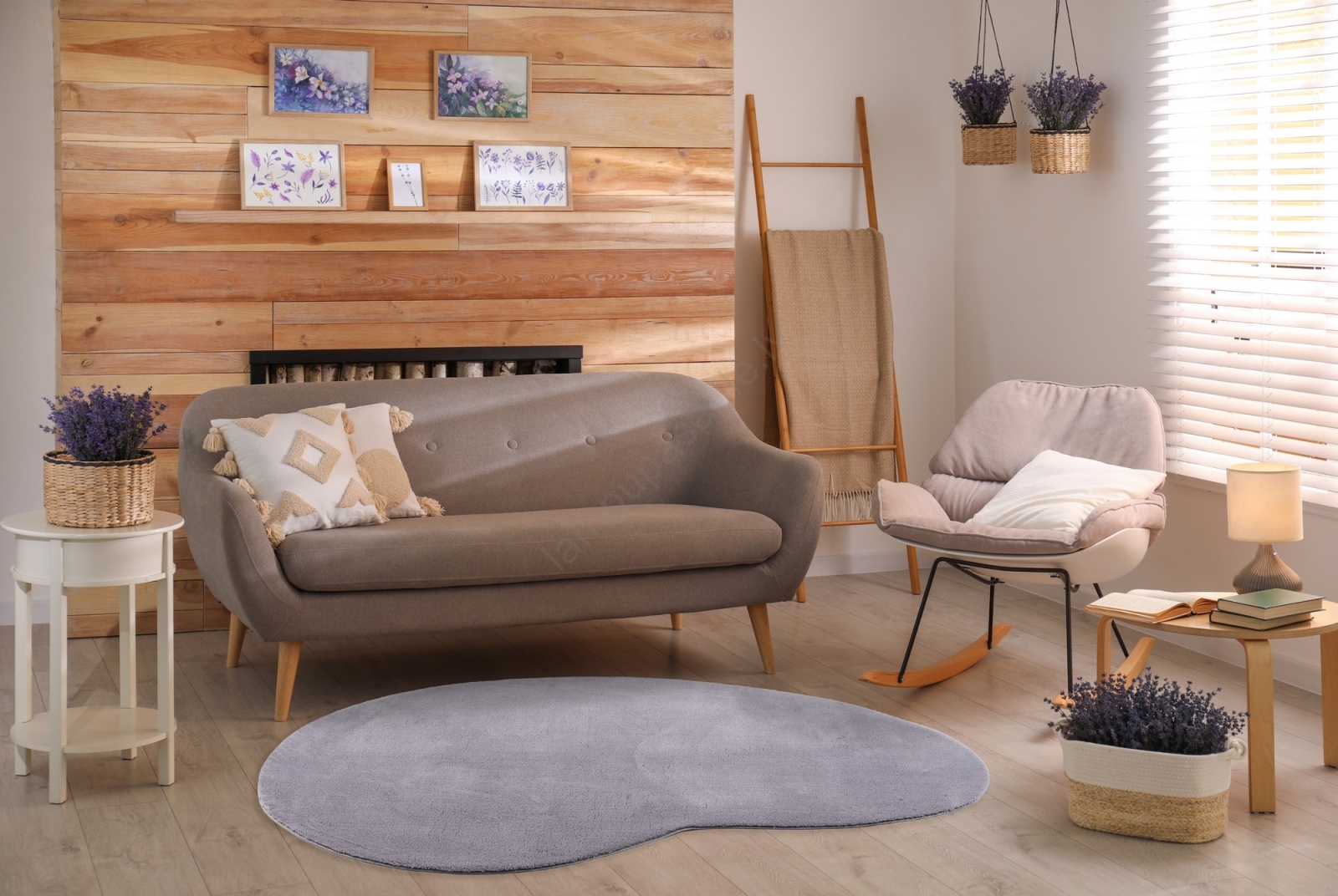 • Elegants pupiņas formas paklājs.