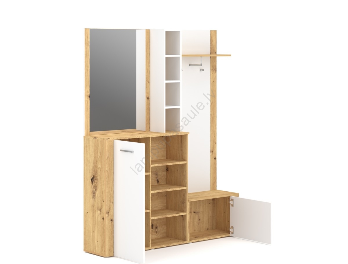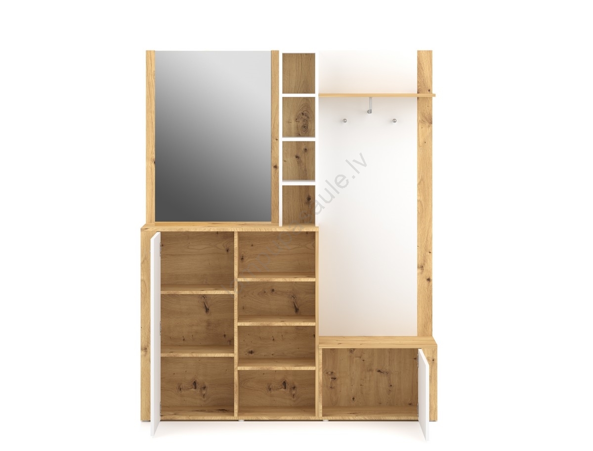 • Atvērtie plaukti, āķi, mēteļu stienis un liels spogulis piedāvā tieši to, kas nepieciešams.