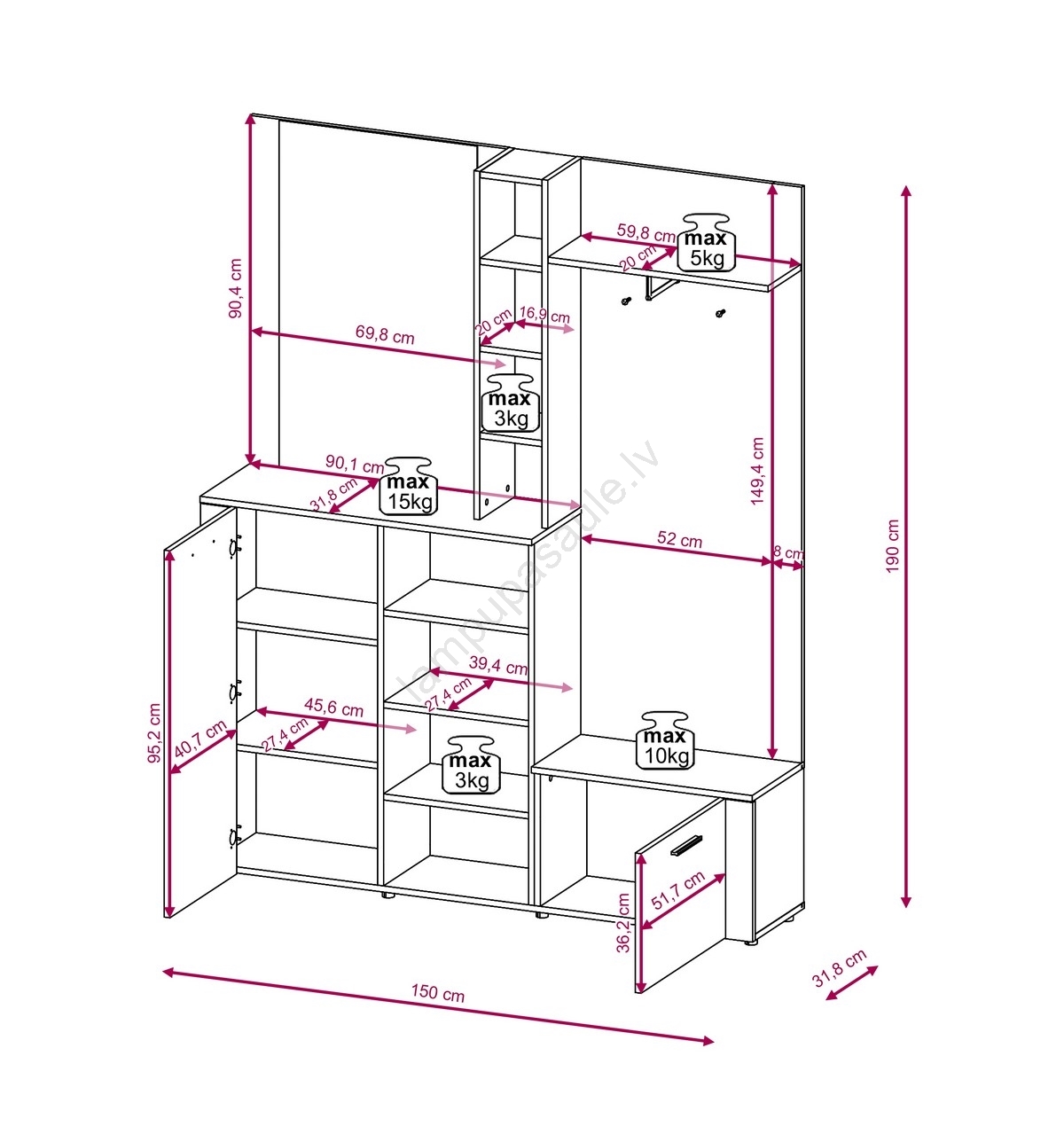 • Zem tās ir vairāki aizvērti nodalījumi un atvērti plaukti apaviem, aksesuāriem vai citiem ikdienas piederumiem.
