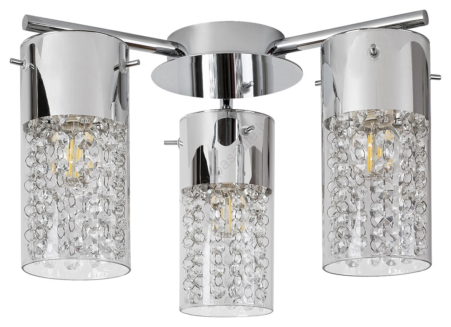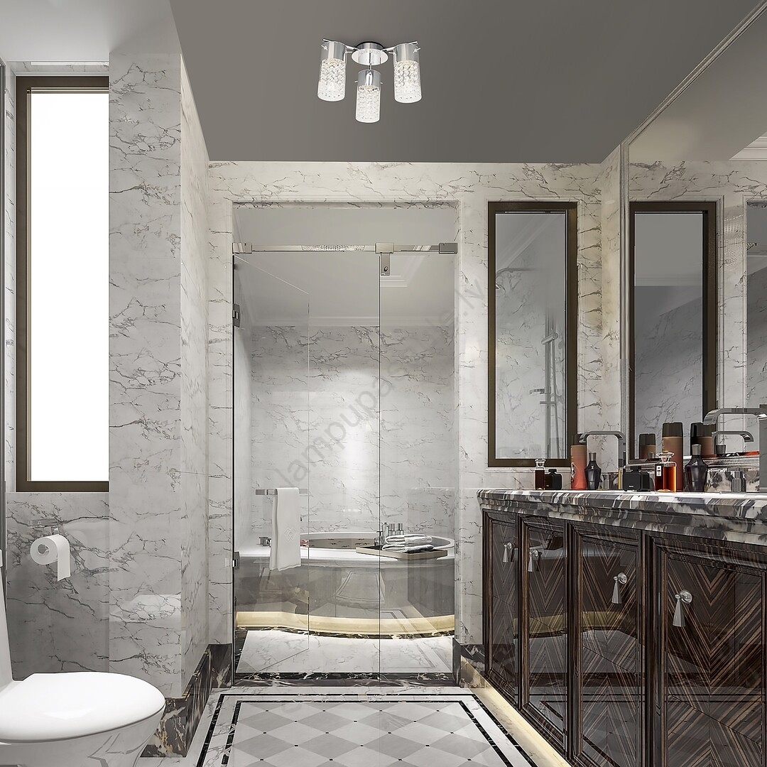 Niagara vannas istabas griestu lampa ar 3 spuldzēm, kas atspoguļo klasisko stilu, būs izteiksmīgs jūsu vannas istabas interjera elements. Šis elegants modelis nodrošina atmosfērisku apgaismojumu jūsu vakara rituālam pirms gulētiešanas. Griestu lampa, kas sastāv no hroma krāsas metāla pamatnes un caurspīdīgiem abažūriem, paredzēta lietošanai ar 3 spuldzēm, katra ar jaudu līdz 40W. Pamatnes tips ir E14. Trīs lampas galviņas karājas uz hroma krāsas balsta stieņiem, kas izvirzīti no apaļas dekoratīvas pamatnes. Niagara lampa ir papildināta ar dekoratīviem kristāla elementiem zem stikla abažūriem, kas atgādina ūdenskritumu – kā norāda lampas nosaukums. IP44 aizsardzības klase nodrošina aizsardzību pret cieto daļiņu iekļūšanu līdz 1 mm diametrā un pret ūdens šļakatām no jebkura virziena. Šīs vannas istabas griestu lampas izmēri ir: platums 335 mm, attālums no griestiem 215 mm, uzstādīšanas diametrs 100 mm. Šis modelis tiek piegādāts bez gaismas avotiem.