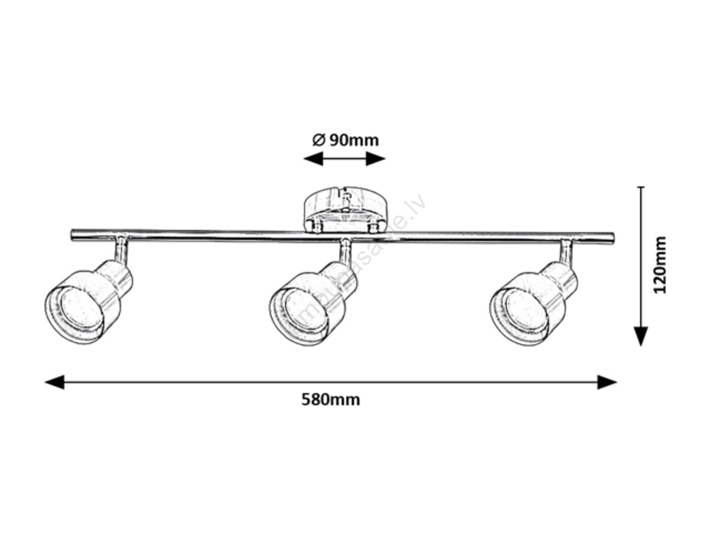 Mūsdienīgs Blake prožektoru gaismeklis ar 3 spuldzēm var būt lieliska izvēle dažādām jūsu dzīvokļa telpām: to var uzstādīt viesistabā, guļamistabā, ēdamistabā vai pat virtuvē. Šis pilnībā metāla gaismeklis ar satīna hroma apdari tiek piestiprināts pie sienas, izmantojot apaļu dekoratīvu pamatni. Elastīgās gaismekļa galviņas ir novietotas uz horizontālas balsta stieņa, kas piestiprināts pie dekoratīvās pamatnes. Ar tām jūs viegli un efektīvi apgaismosiet visu telpu. Blake gaismekli var izmantot ar trim spuldzēm, katras jauda līdz 50W. Pamatnes tips ir GU10. Atkarībā no jūsu gaumes un uzstādīšanas vietas varat izvēlēties siltas vai dabīgas baltas gaismas avotus. Šī prožektoru gaismekļa ar 3 spuldzēm izmēri ir šādi: platums 580 mm, augstums 145 mm, attālums no griestiem 120 mm. Šis modelis tiek piegādāts bez gaismas avota.
