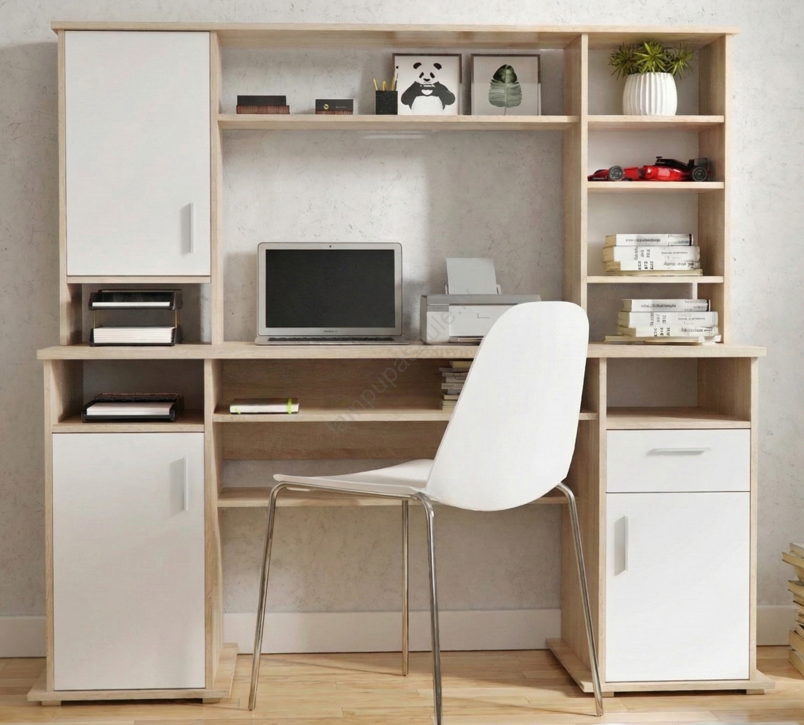 • Augšējā daļa nodrošina papildu plauktus grāmatām, dekorācijām vai biroja piederumiem, padarot to ideāli piemērotu darba vietām, kurām svarīga gan funkcionalitāte, gan kārtība.