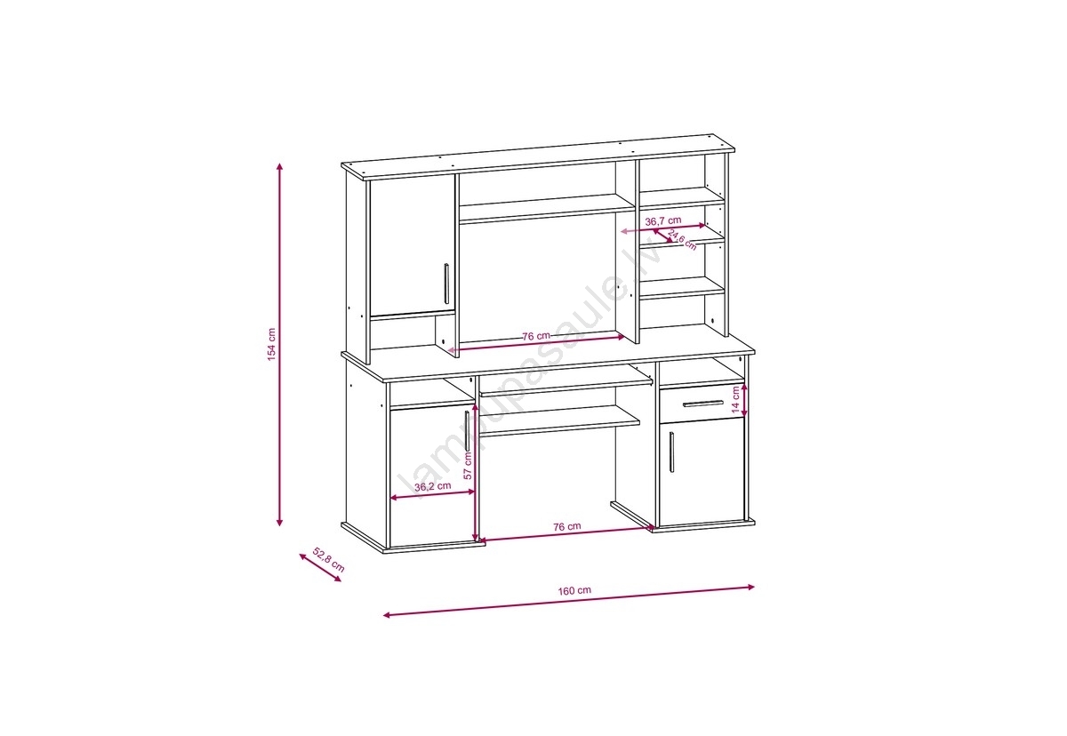 • Piedāvā plašu darba virsmu, izvelkamu klaviatūras atvilktni un vairākus uzglabāšanas nodalījumus, tostarp aizvērtus skapīšus, atvērtus plauktus un vertikālas nodalnes.