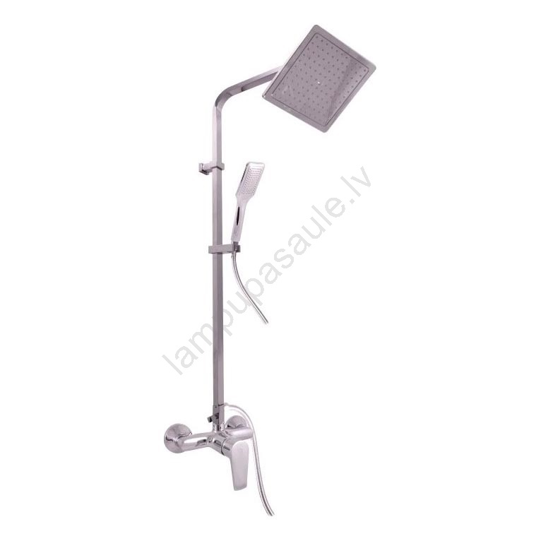 • Komplekts satur: dušas jaucējkrānu, pretkaļķainu vienas pozīcijas rokas dušu, pretkaļķainu galvas dušu (20 x 20 cm), metāla dušas šļūteni ar dubulto savienojumu (garums 150 cm), dušas stieni ar vienu sienas stiprinājumu.