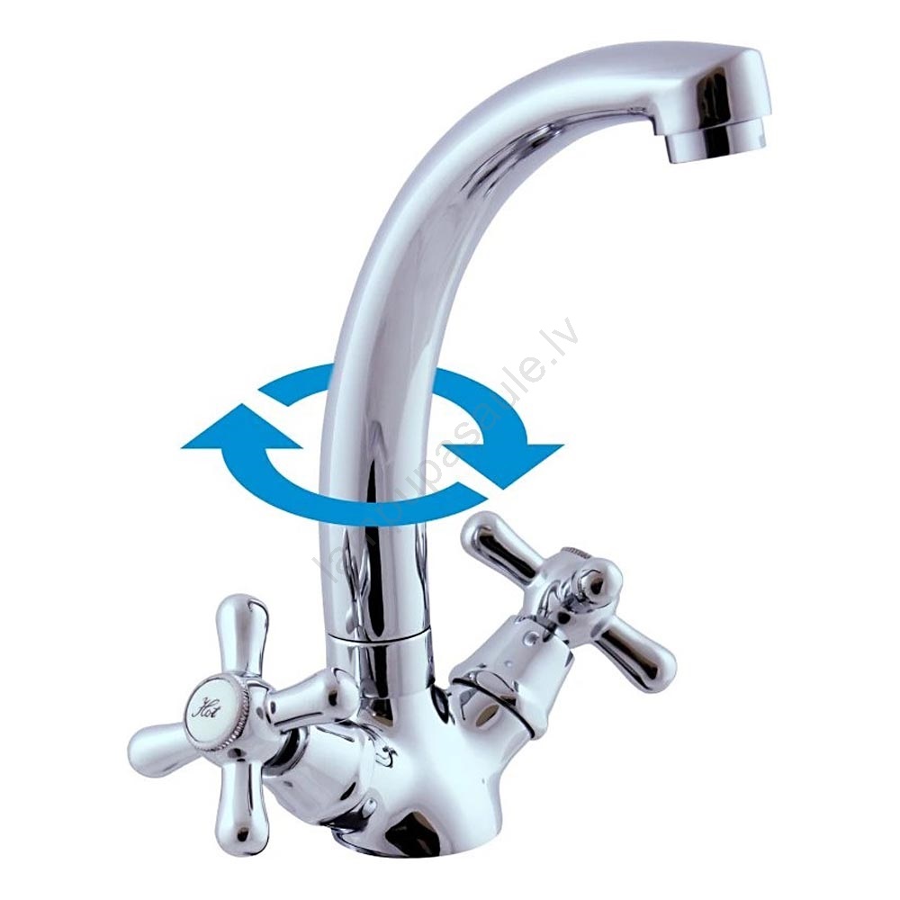 • Uz izlietnes stāvošs jaucējkrāns ar grozāmu izplūdi.