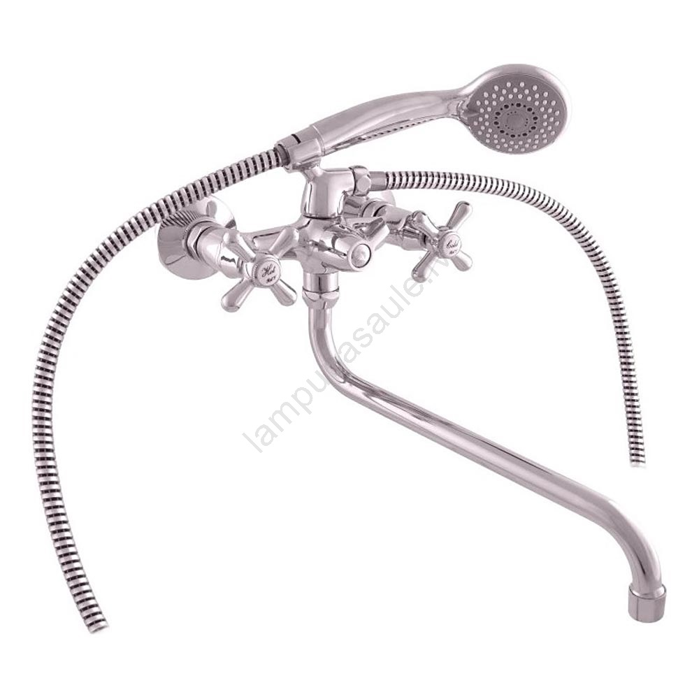 • Vannas komplekts ar sienas stiprināmu vannas jaucējkrānu ar keramikas pārslēgu, apaļu izteku, dušu un dušas turētāju.