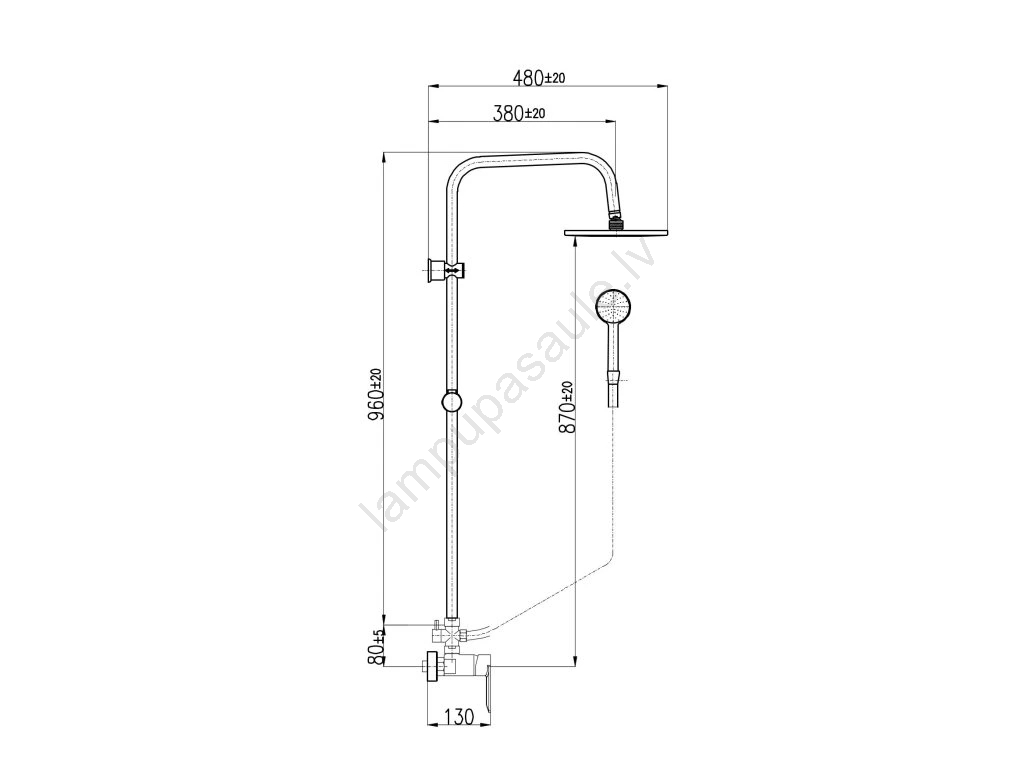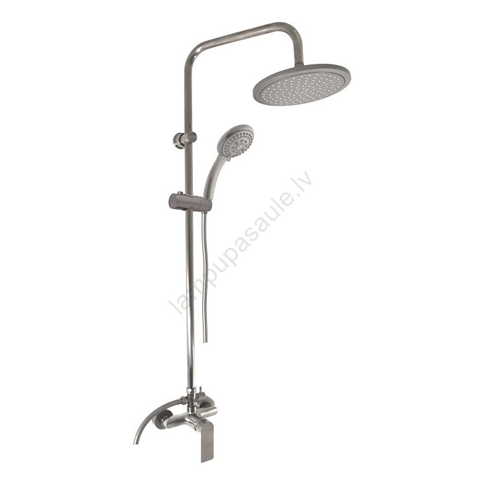 • Komplekts ietver: dušas jaucējkrānu, plastmasas rokas dušu ar 5 funkcijām (pr. 100 mm), plastmasas galvas dušu (pr. 200 mm), dušas metāla šļūteni (1500 mm), dušas stieni.