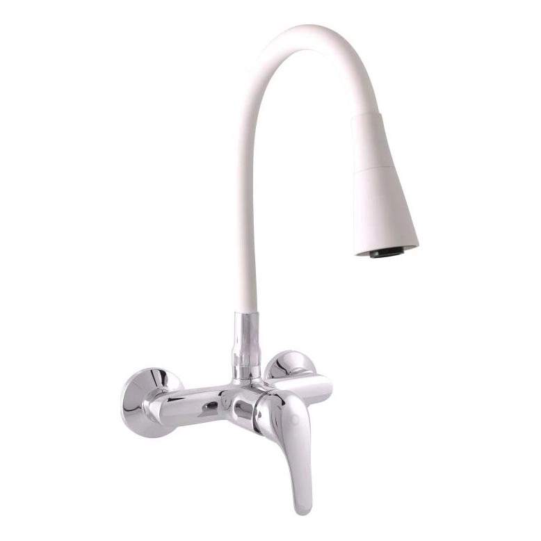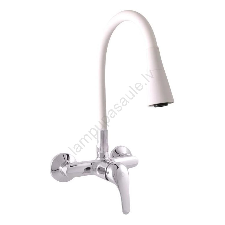 • Sienas uzstādāms izlietnes jaucējkrāns ar elastīgu, pagriežamu izplūdes galu un izvelkamu izsmidzinātāju.