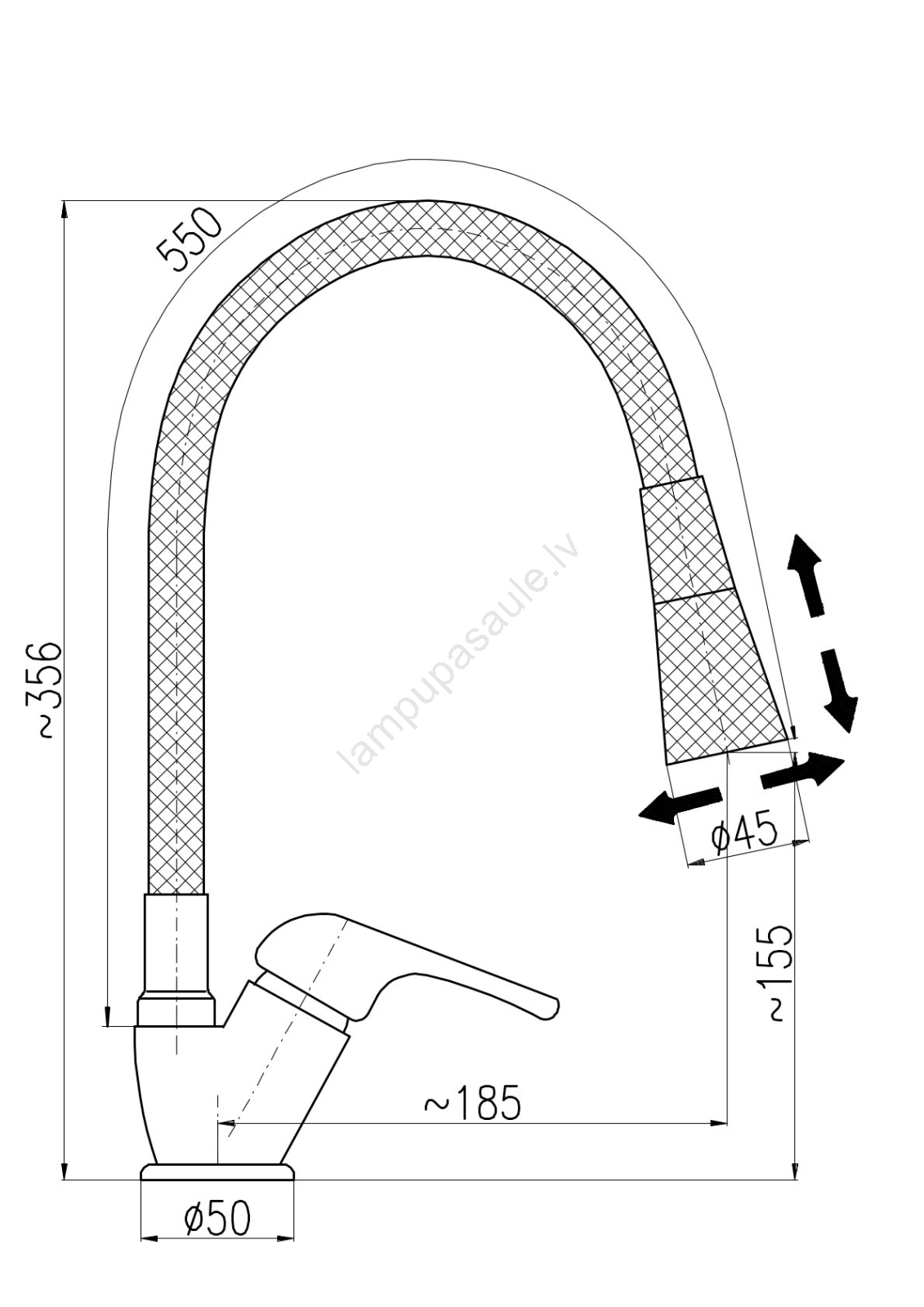 • Virsmas uzstādāms izlietnes jaucējkrāns ar elastīgu, pagriežamu iztecēju un izvelkamu dušas galvu.