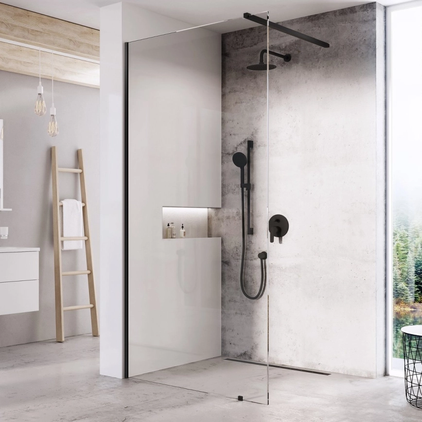• Komplektā ietilpst fiksētā stikla siena, regulējamais profils, balsts un metāla balsts melnā apdarē.