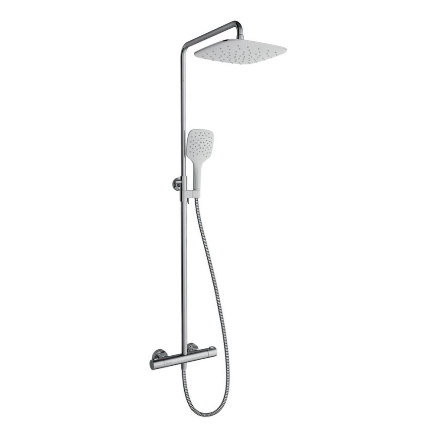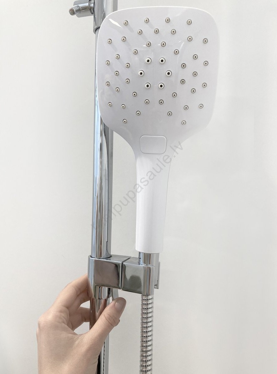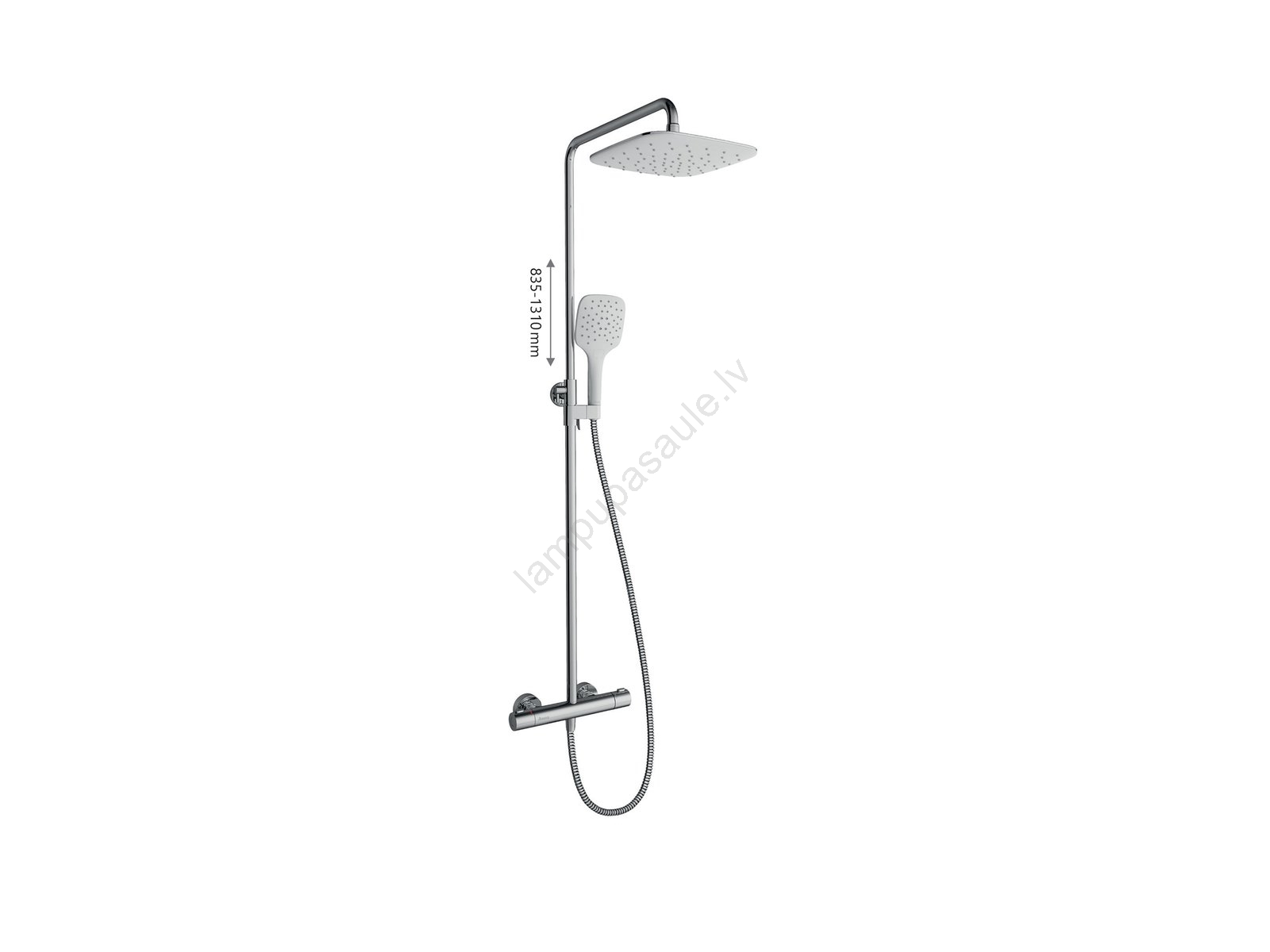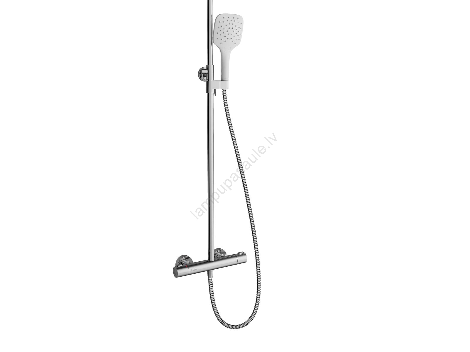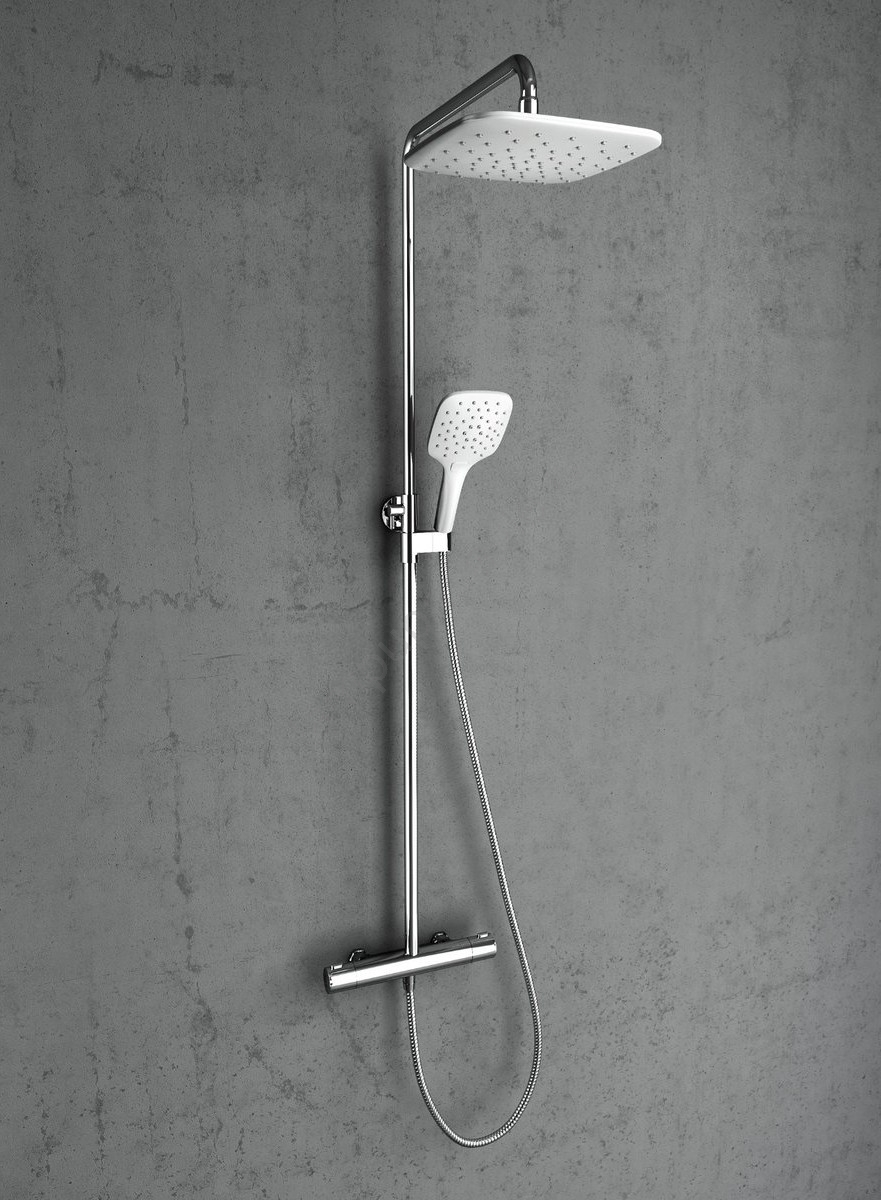 • Dušas stabs Termo ir slīdējošs komplekts ar termostatisku jaucējkrānu spīdīgā hroma apdarē un baltu galvas dušu.
