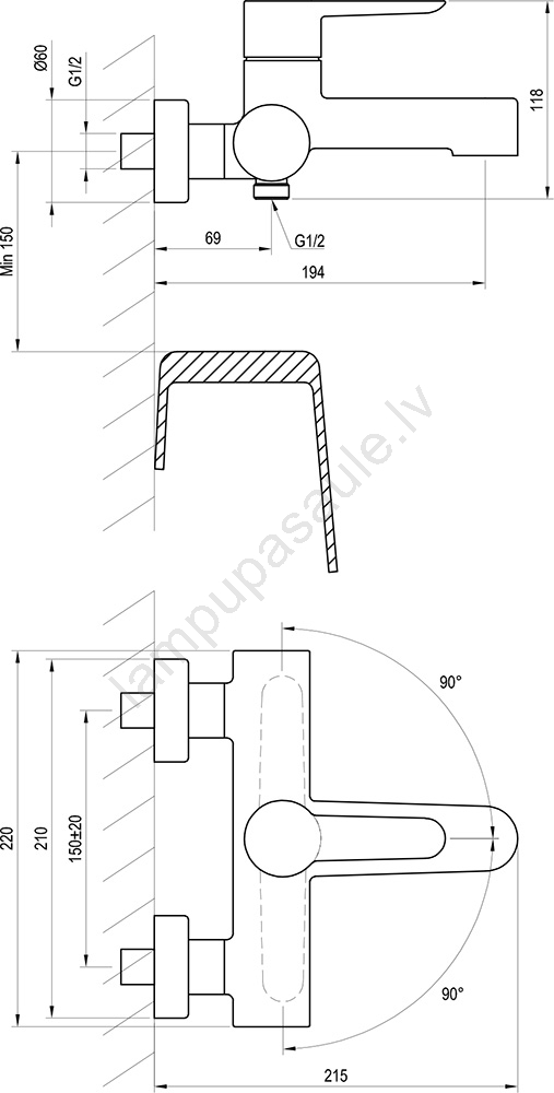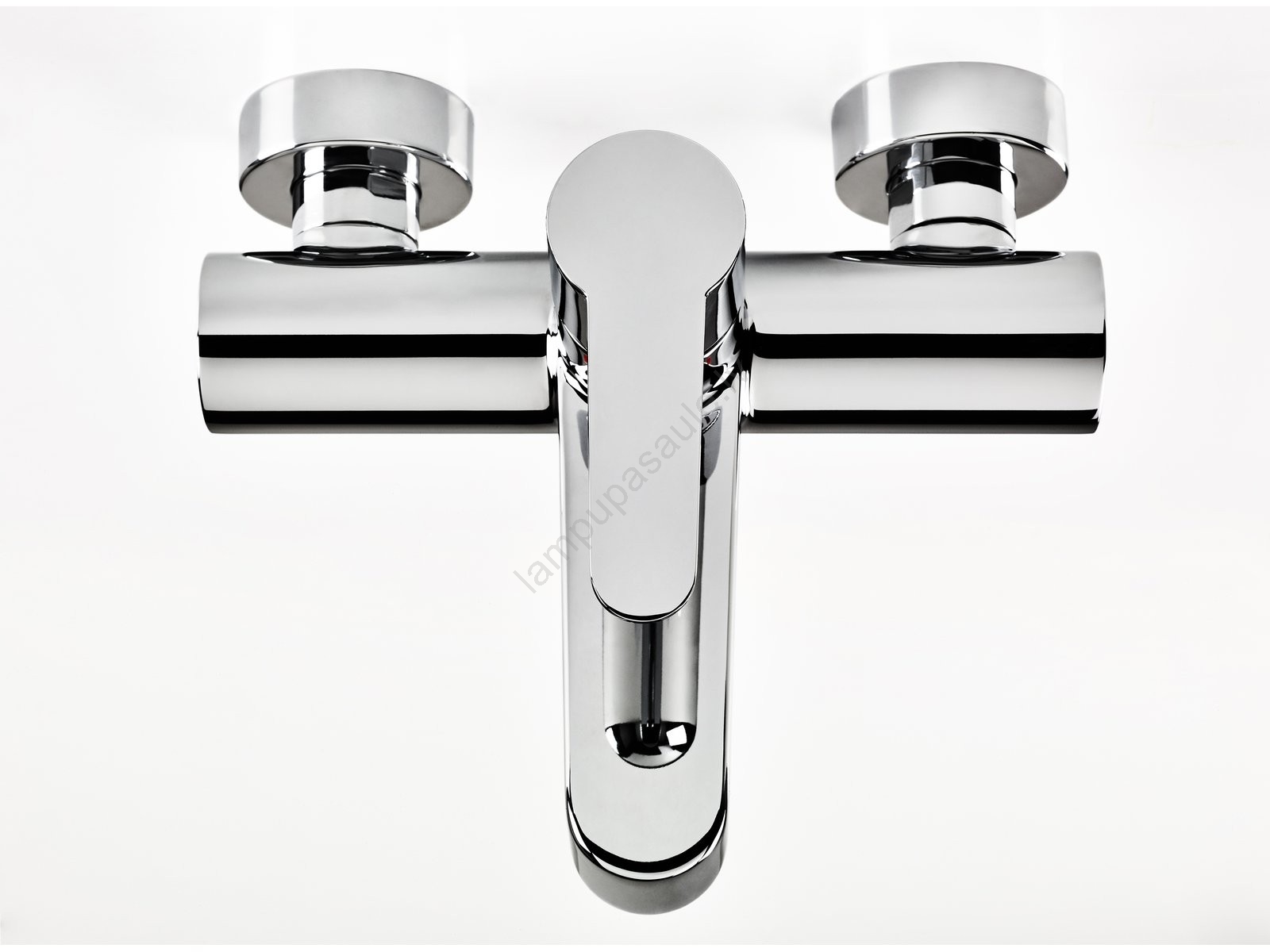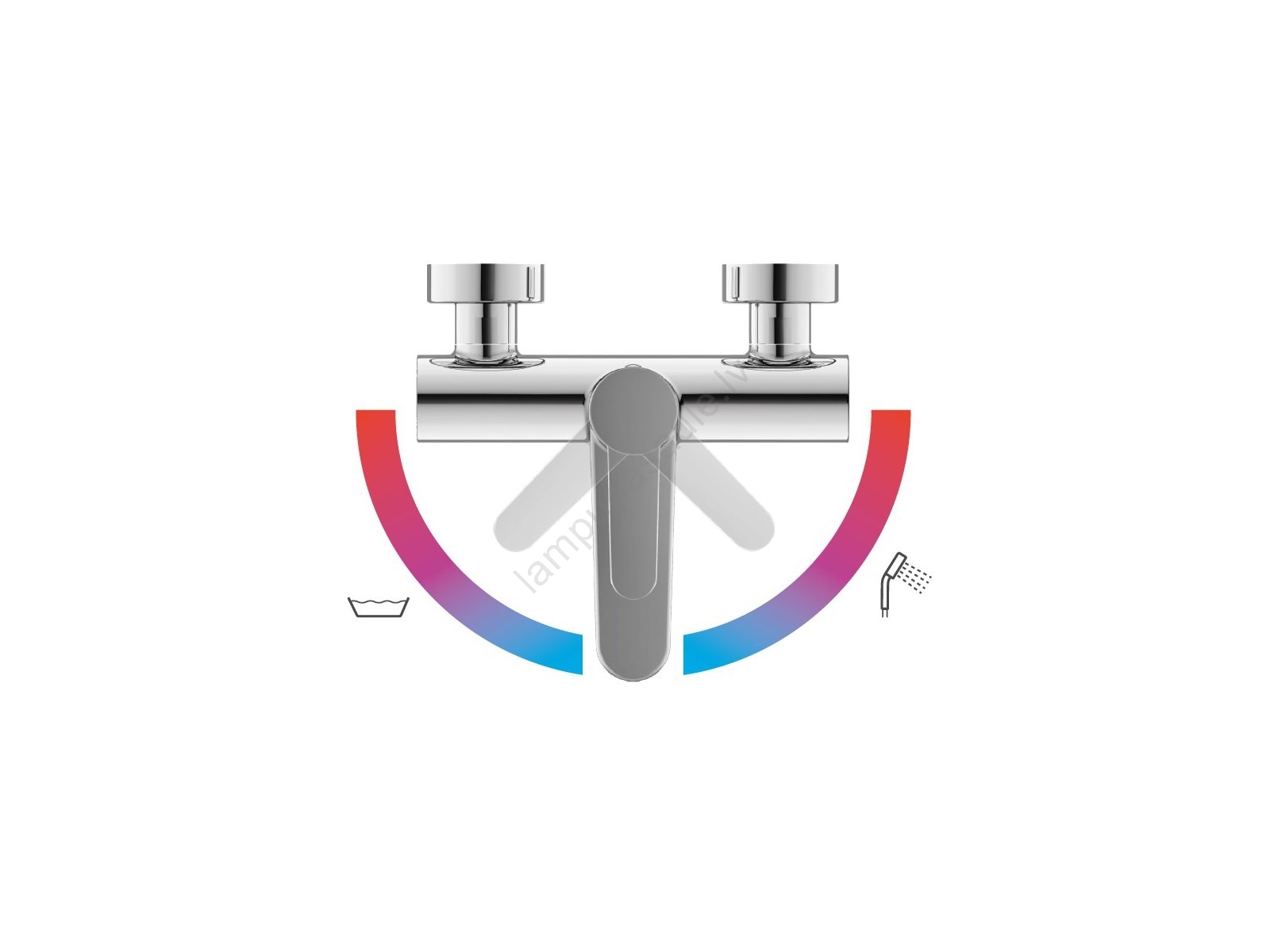• Pārvietojot sviru pa labi (duša), vai pa kreisi (vanna), tiek regulēta tikai ūdens temperatūra, ūdens plūsma paliek stabila.