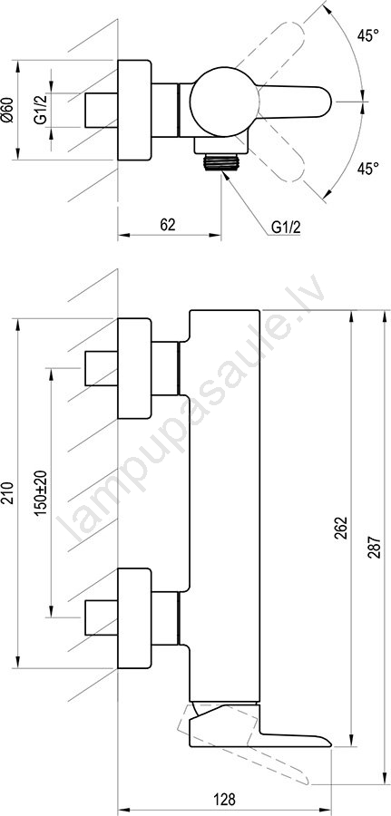 • Savienojumu attālums 150 mm ļauj uzstādīt to pie visām dušas kabīnēm.