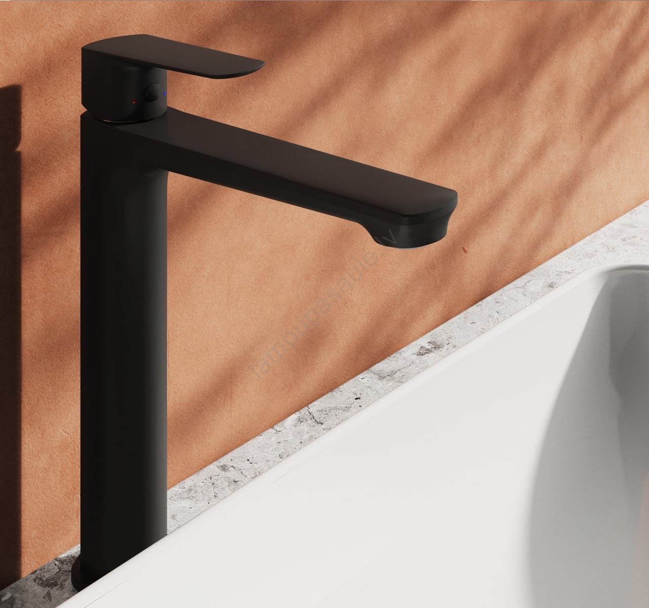 • Izlietnes jaucējkrāns Life melnā krāsā ar īpaši pagarinātu augstumu 280 mm — ideāli piemērots uz virsmas uzstādāmām izlietnēm.
