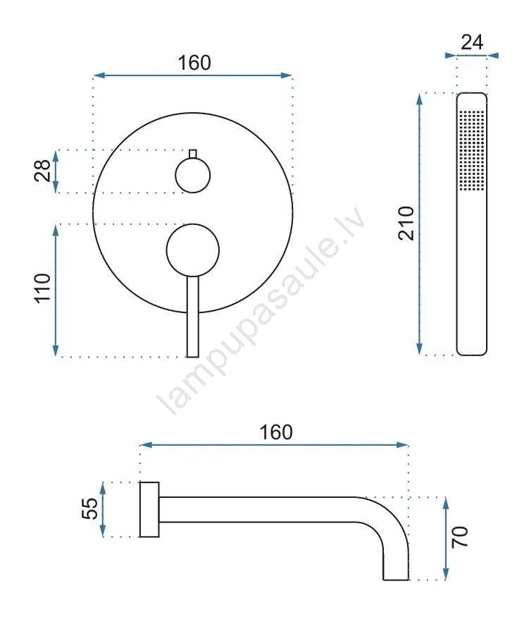 • Komplekts ietver: vannas jaucējkrānu, sienas izvadu, rokas dušu, dušas šļūteni (160 mm), rokas dušas turētāju.