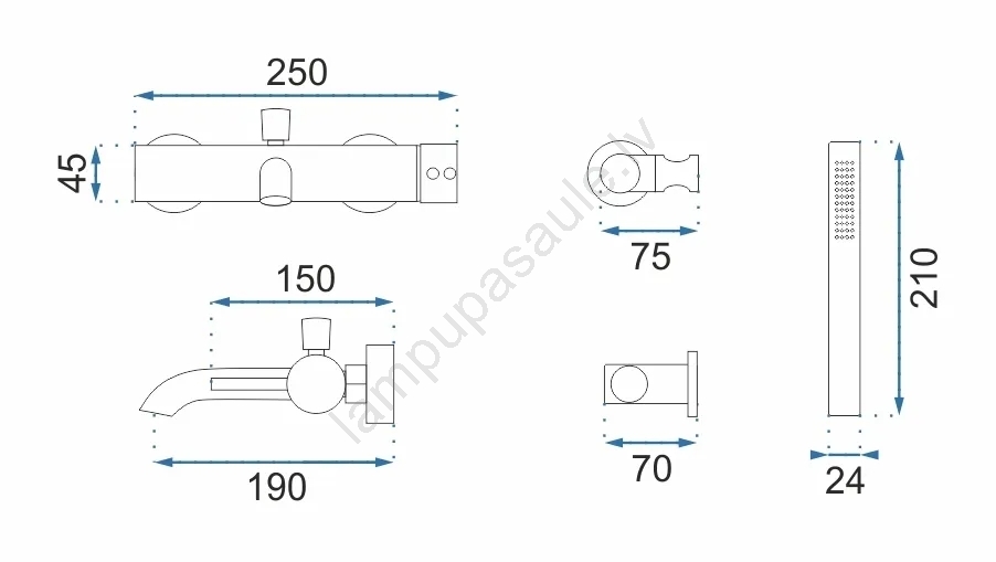 • Komplektā ietilpst: vannas jaucējkrāns, rokas duša, dušas šļūtene (190 mm), rokas dušas turētājs.
