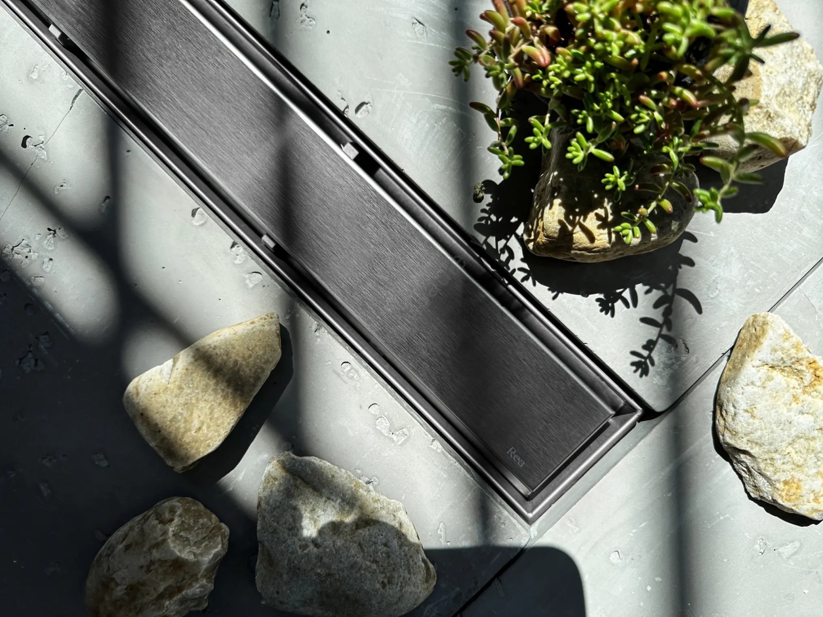 • Lineārais dušas notekas kanāls 90 cm garumā slīpētas nerūsējošā tērauda apdarē.