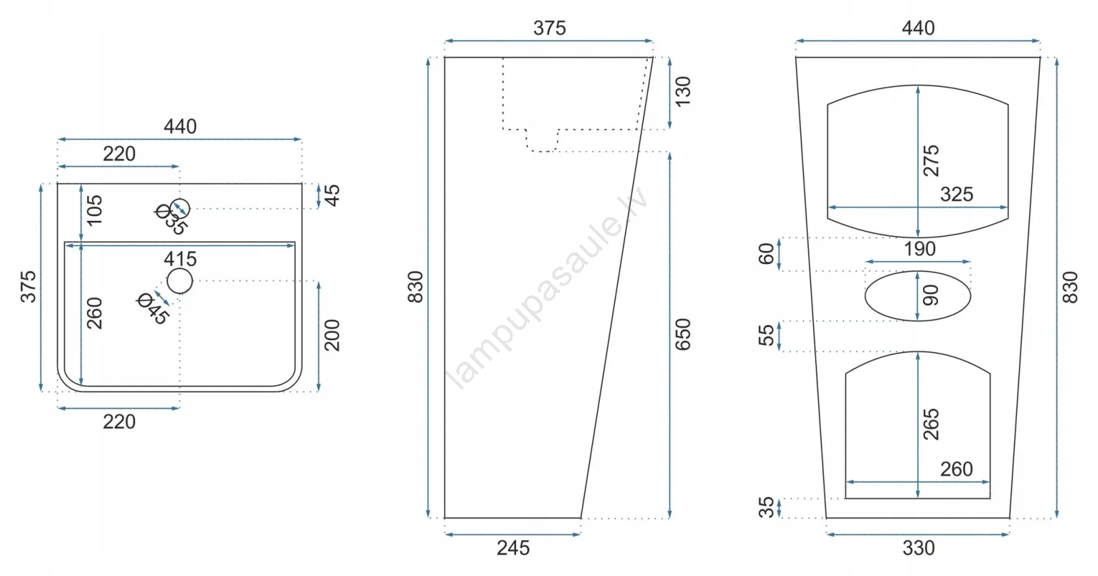 • Izlietnes jaucējkrāns un sifons nav komplektā.