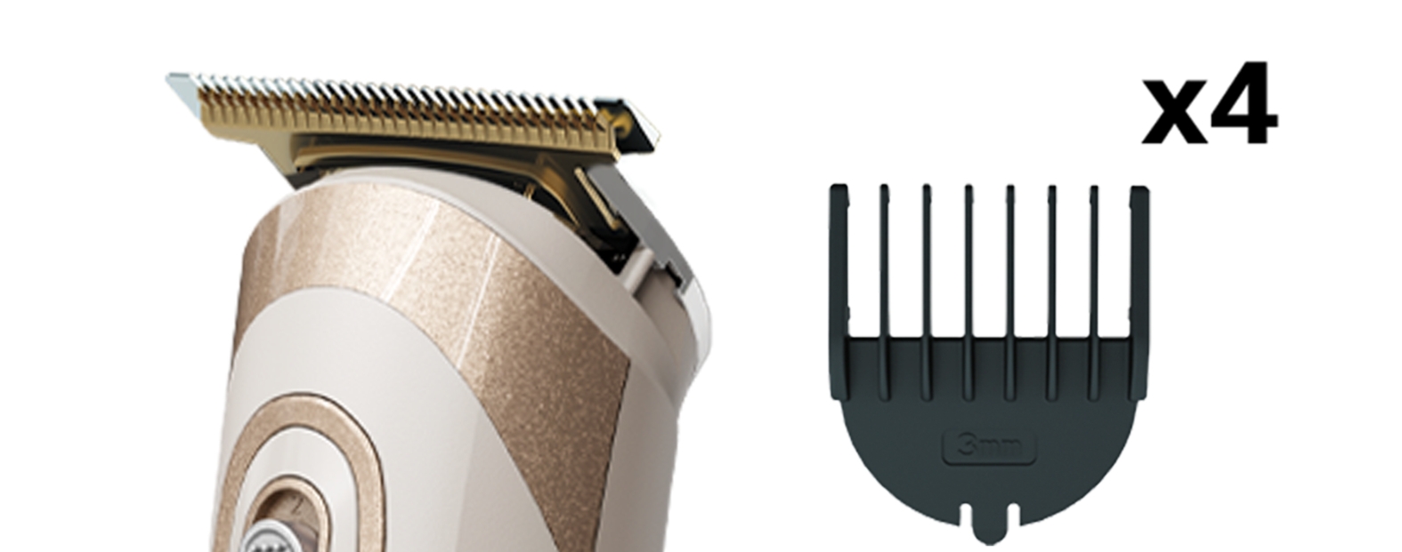 • Regulējams bārdas uzgalis (3–7 mm) ar 1 mm precizitāti un 4 fiksēti matu uzgaļi (3-6-9-12 mm).