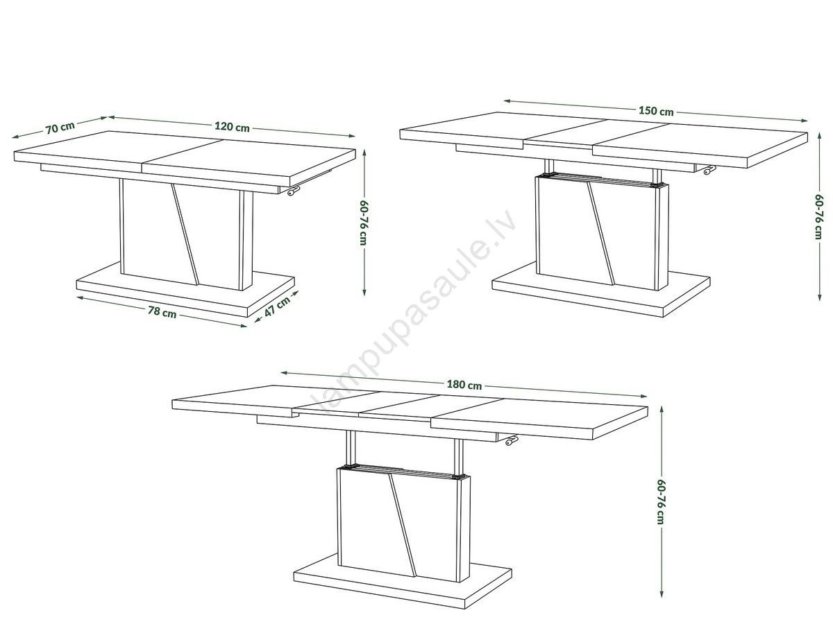 • Pateicoties divām 30 cm ieliktņiem, galda virsmu var palielināt līdz 150 vai 180 cm.