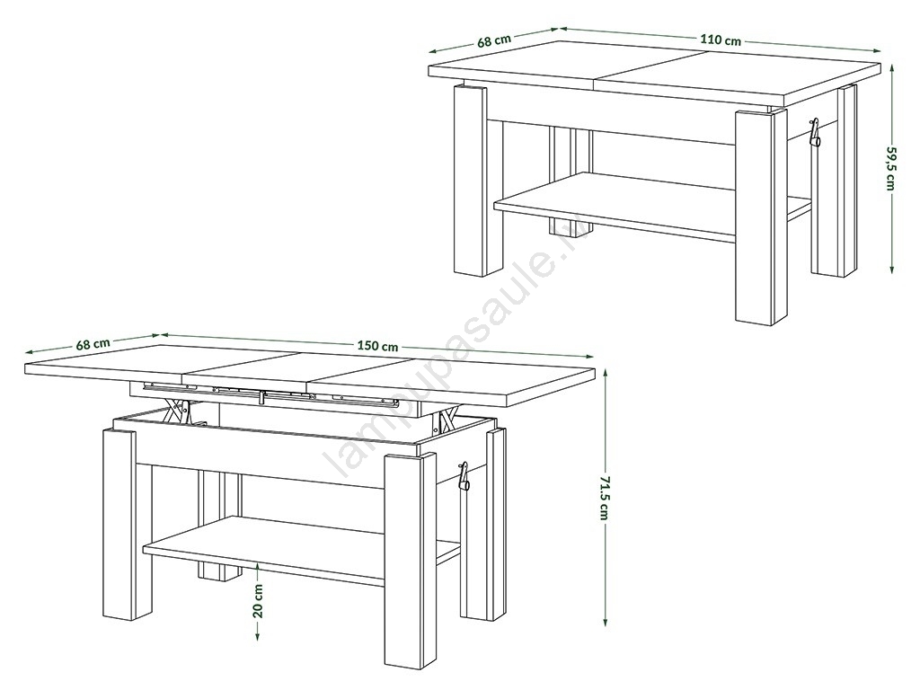 • Izvērsta galda izmērs: 150x68 cm.