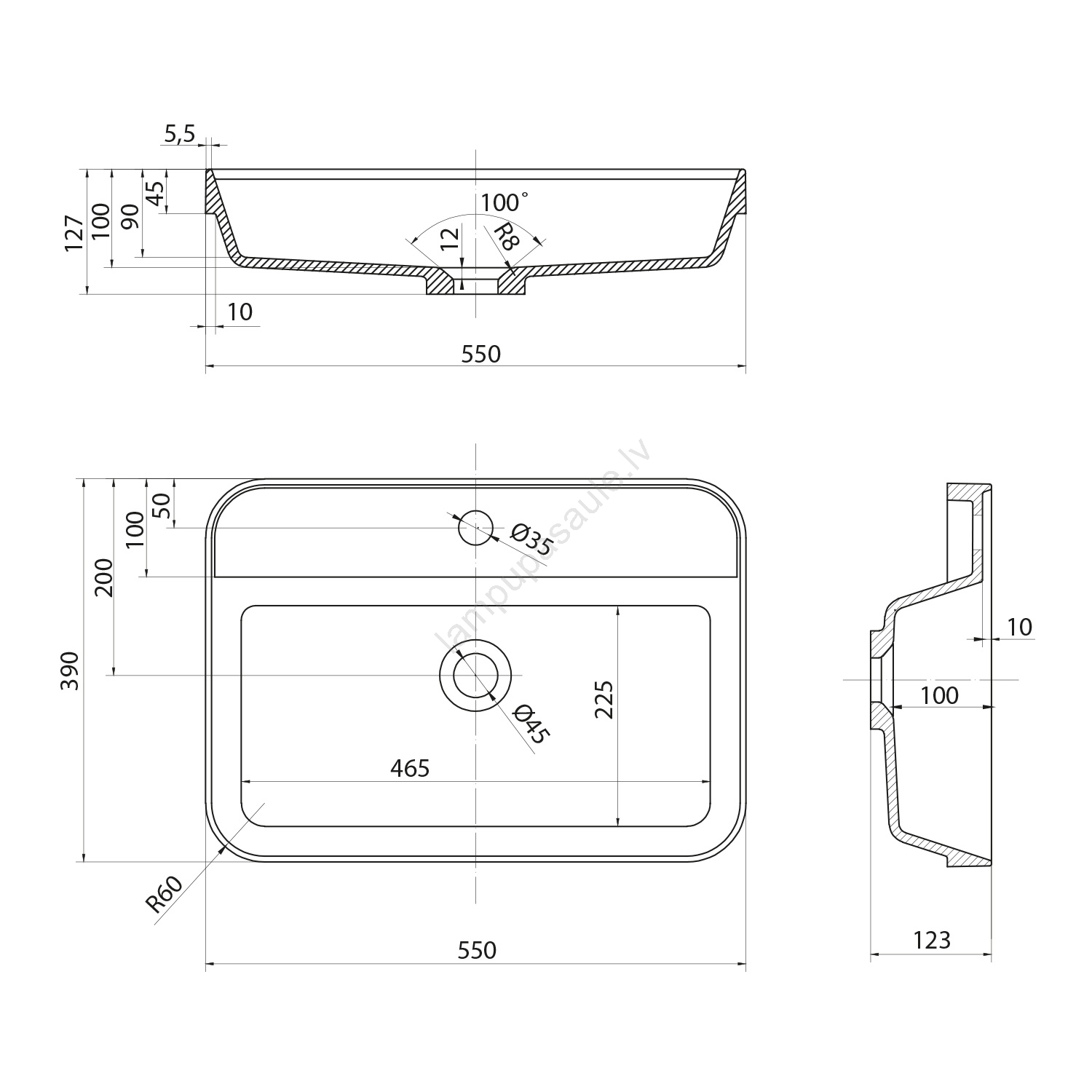 • Izlietne ir zemuzstādāma un izgatavota no Solid Surface materiāla.