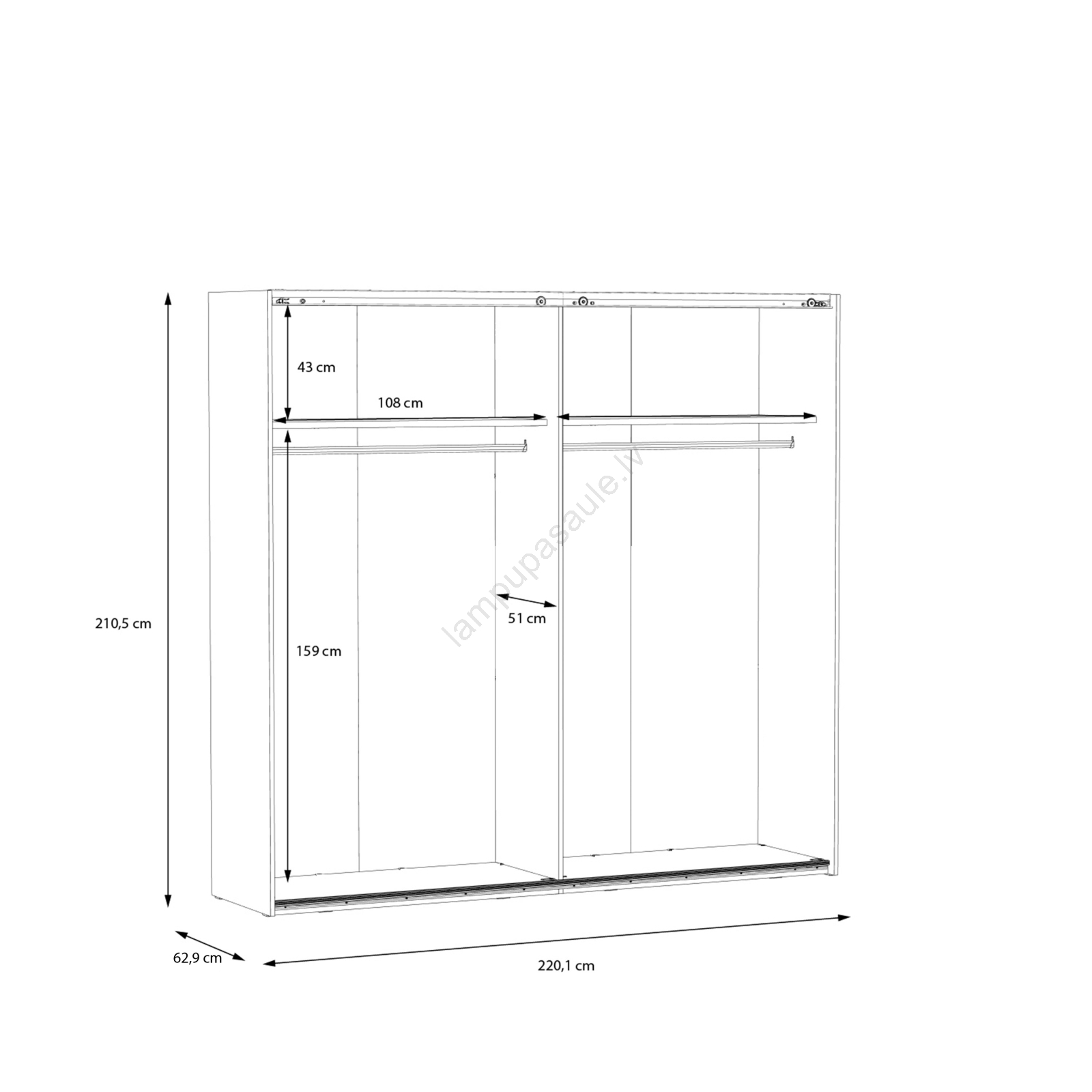 • Skapis aprīkots ar drēbju stangām, plauktiem un lielu uzglabāšanas vietu jūsu apģērbam, somām un sezonālām mantām.