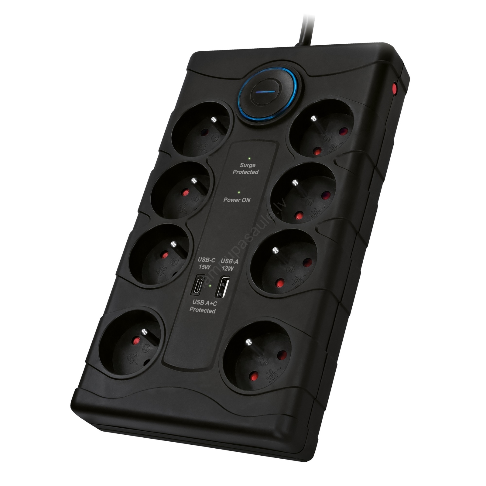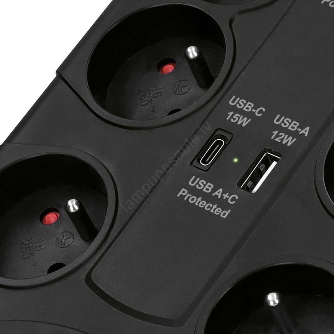 • LED indikācija: Pārsprieguma aizsardzība aktīva; 230 V kontaktligzdas aizsargātas; USB A + C porti aizsargāti.