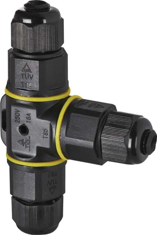 • Ūdensizturīga kabeļa T savienotājs vadu savienošanai.
