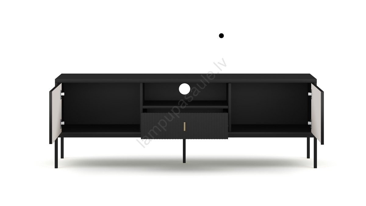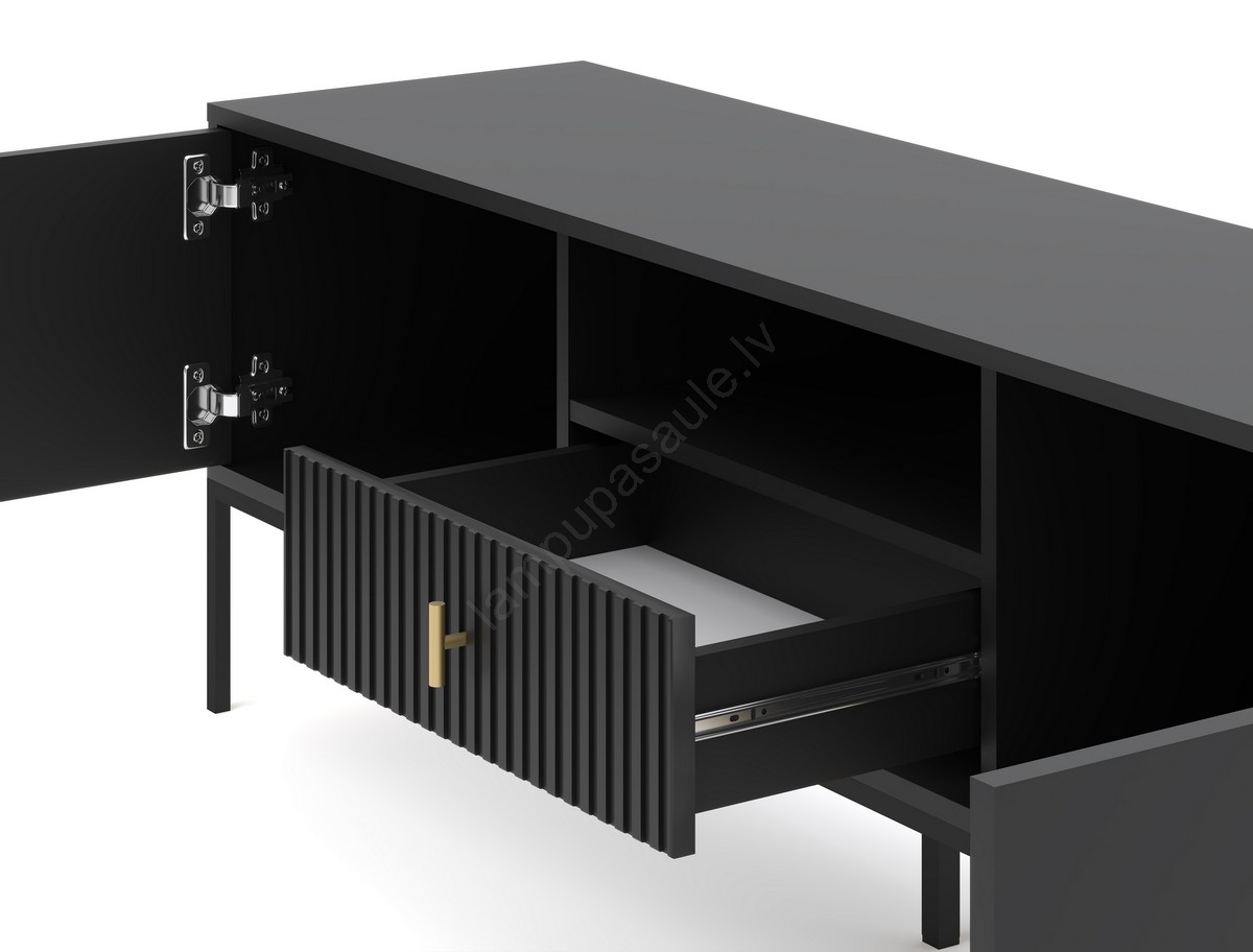 • Tam ir divi slēgti sānu nodalījumi, atvērts plaukts ar kabeļa atveri centrā un atvilktne zem plaukta ar rievotu apdari.