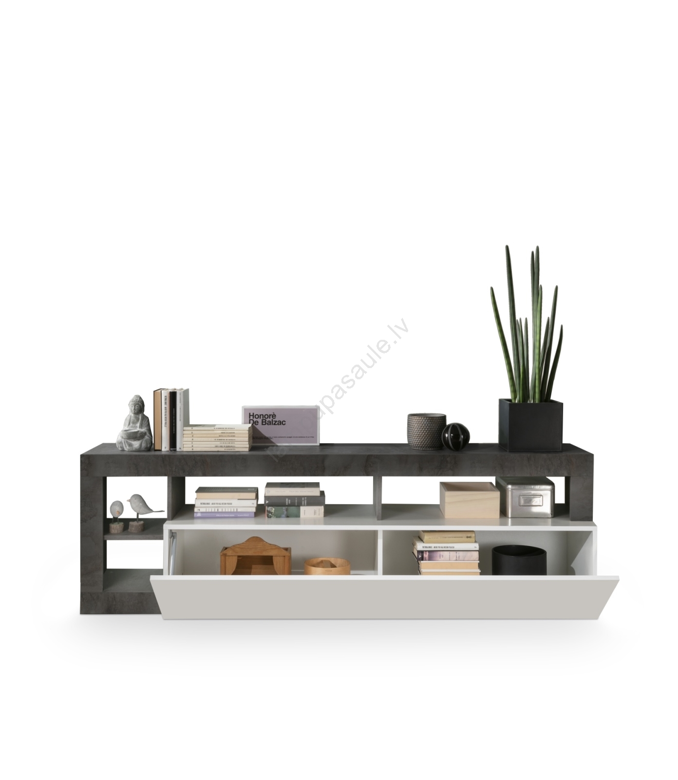 • Apakšējais nodalījums un atklātie plaukti nodrošina vietu grāmatām, dekorācijām un mājsaimniecības piederumiem.