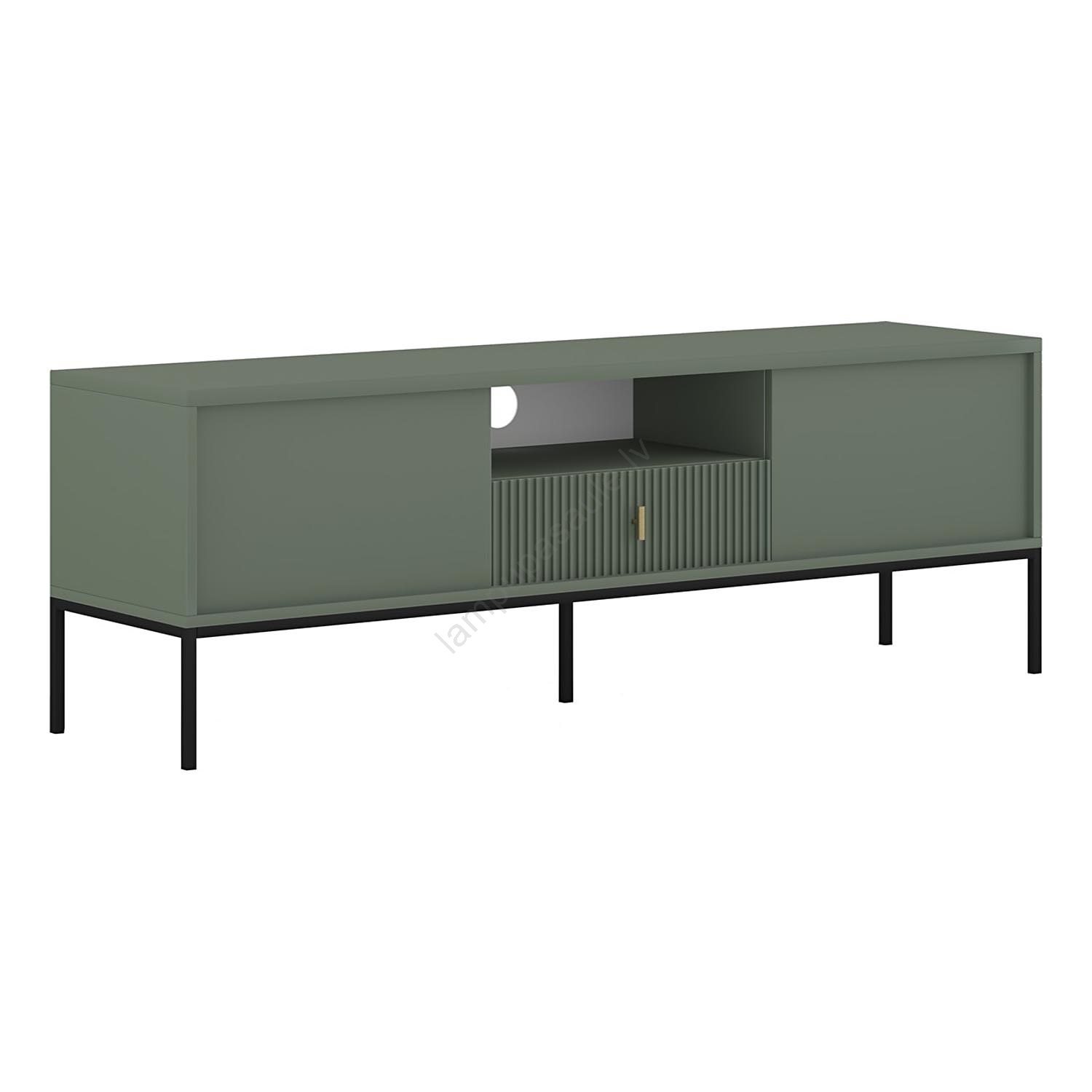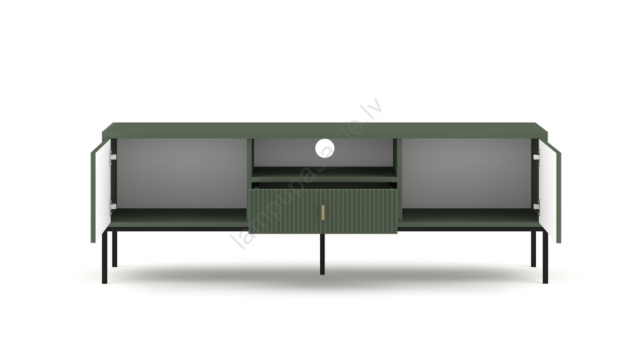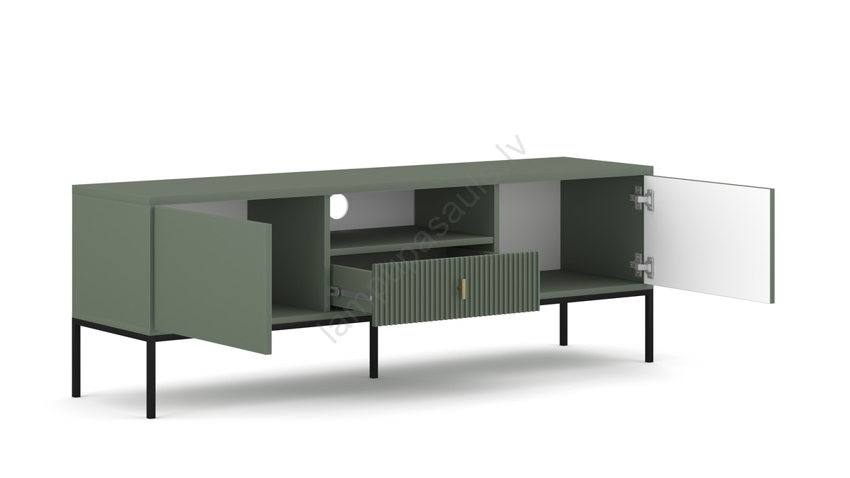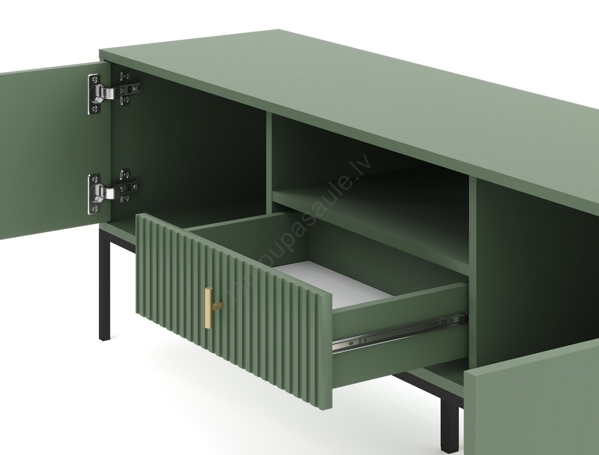 • Tam ir divi slēgti sānu nodalījumi, atvērts plaukts ar kabeļa atveri centrā un atvilktne zem plaukta ar rievotu priekšpusi.